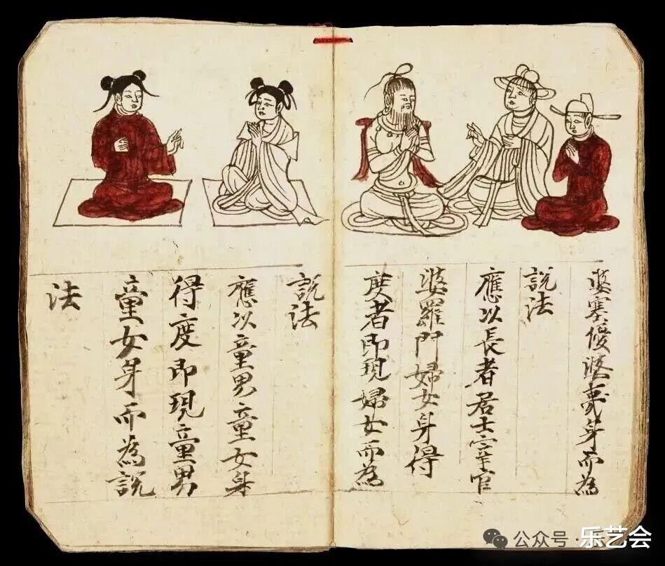 下图为晚唐五代宋归义军时期的《观世音菩萨普门品》线装本,此页左侧就是上述的以童男、童女身得度,即现童男、童女身而为说法的相应配图。大家可以看到,晚唐时期的风格呈现与后世的庭院风格迥然不同,当然这也许是因为版面局限,不能全景呈现,只能撷取主要人物元素进行选择性呈现的缘故。