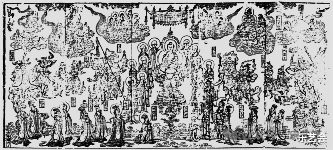 《妙法莲华经》通称为《法华经》,是大乘佛教经典中最重要的一部经。第二十五章“观世音菩萨普门品 ”,主要叙述观世音菩萨功德。所附插图,大致分二类: 一是绘刻释迦牟尼佛在灵山说法情景;二是“变相图”、“经变图”。《妙法莲华经·观世音菩萨普门品》,唐五代本未见,宋及西夏皆刊有上图下文本。元至顺二年本始以一段文字配整版图一幅。其后明洪武本、宣德本、清康熙本,皆据以摹刻,画面局部要素有所变化。下图为西夏文《妙法莲花经观世音菩萨普门品》插图。