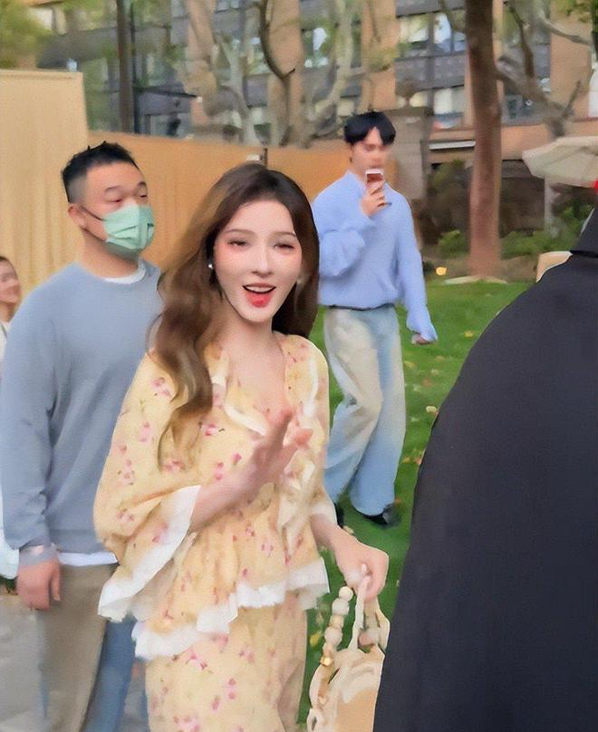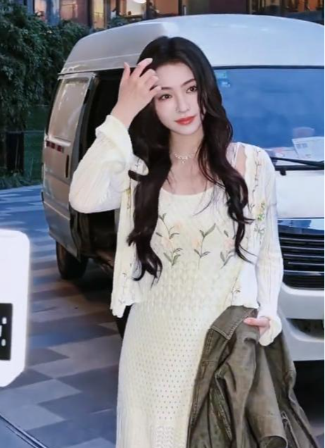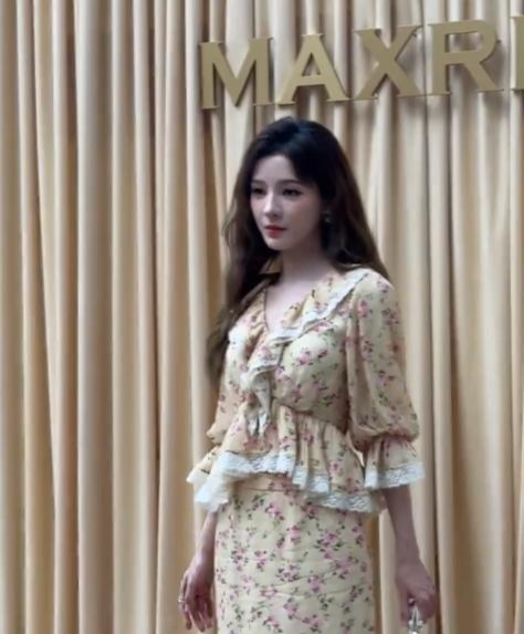 35岁的张予曦,身穿黄色小碎花裙子,搭配大波浪卷发型,再加上建模脸,很有特点。