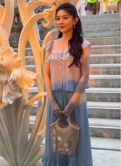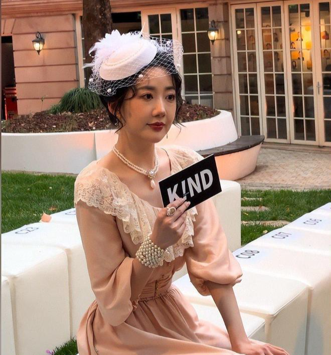 32岁的陈欣予,身穿雪纺布料的粉色公主裙,手中拿着一束玫红+白色的玫瑰花,加上脖子上的珍珠项链,有种大家闺秀的既视感。