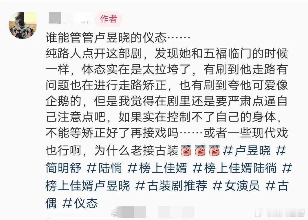 这次是卢昱晓,她在《云之羽》女二之后多了很多买股粉,上一次《五福临门》的仪态被吐槽(图四五六),《小巷人家》演技被吐槽,这次《榜上佳婿》里面又胖了,感觉她没抓住上升期给她的机会。