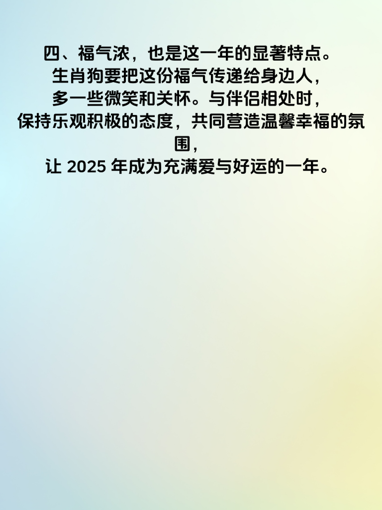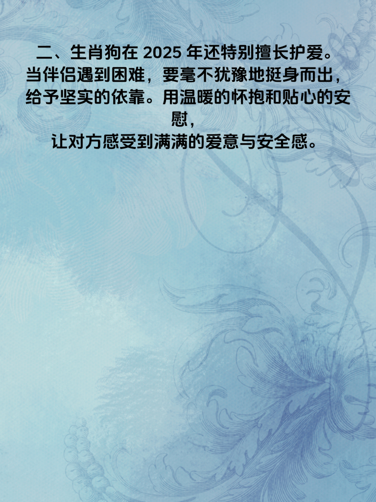 一、2025 年,生肖狗的运势可谓大放异彩。在情感方面,他们将展现出无比的忠情,是值得托付真心的伴侣。对于追求爱情的生肖狗男生来说,这是绝佳时机。要学会用实际行动表达忠诚,比如记住对方的喜好,在特殊日子精心准备惊喜。 二、生肖狗在 2025 年还特别擅长护爱。当伴侣遇到困难,要毫不犹豫地挺身而出,给予坚实的依靠。用温暖的怀抱和贴心的安慰,让对方感受到满满的爱意与安全感。 三、财运上,生肖狗也有好消息。财库渐丰,意味着他们有更多的物质基础去经营感情。可以带心爱的人去享受高品质的约会,送一些有意义的礼物。但要注意,财富是为了让感情更美好,别本末倒置。 四、福气浓也是这一年的显著特点。生肖狗要把这份福气传递给身边人,多一些微笑和关怀。与伴侣相处时,保持乐观积极的态度,共同营造温馨幸福的氛围,让 2025 年成为充满爱与好运的一年。