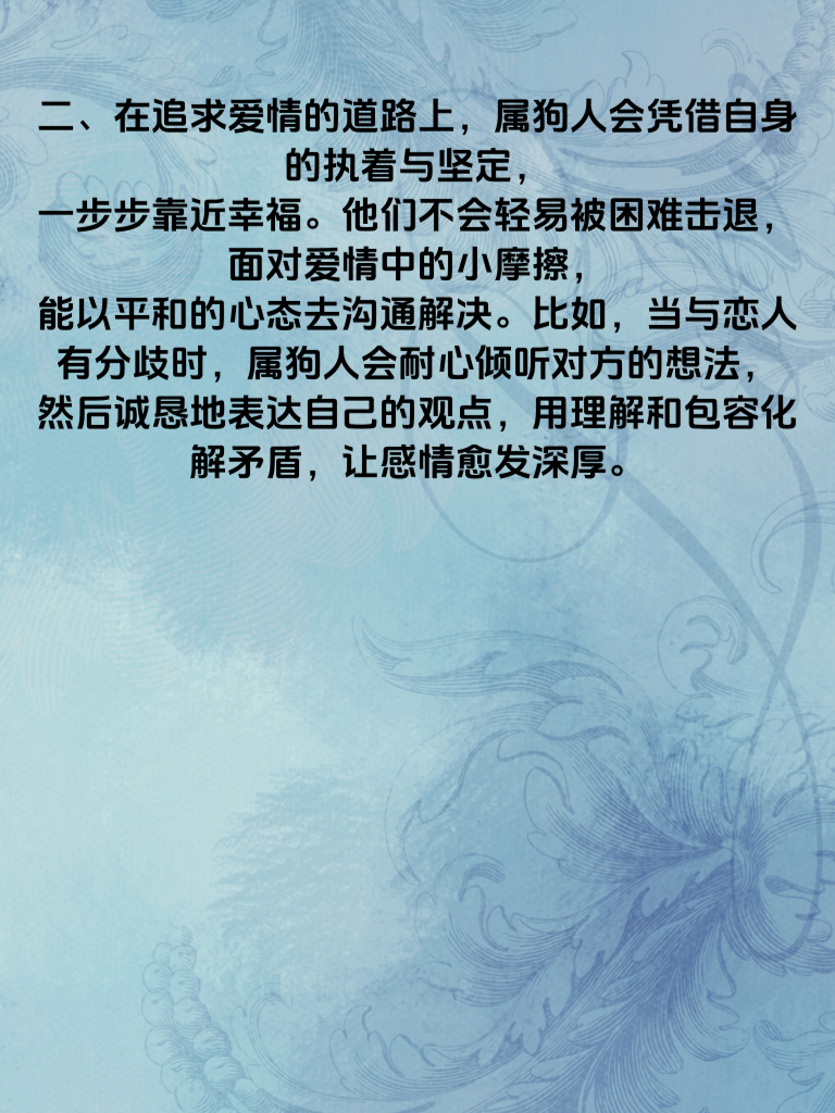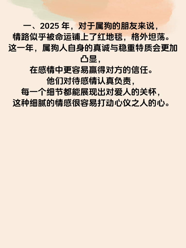 一、2025 年,对于属狗的朋友来说,情路似乎被命运铺上了红地毯,格外坦荡。这一年,属狗人自身的真诚与稳重特质会更加凸显,在感情中更容易赢得对方的信任。他们对待感情认真负责,每一个细节都能展现出对爱人的关怀,这种细腻的情感很容易打动心仪之人的心。 二、在追求爱情的道路上,属狗人会凭借自身的执着与坚定,一步步靠近幸福。他们不会轻易被困难击退,面对爱情中的小摩擦,能以平和的心态去沟通解决。比如,当与恋人有分歧时,属狗人会耐心倾听对方的想法,然后诚恳地表达自己的观点,用理解和包容化解矛盾,让感情愈发深厚。 三、不仅情路顺遂,属狗人在 2025 年财势也悄然暗涨。他们踏实努力的工作态度会带来更多的机遇,在职场上能够稳步前进。凭借自身的智慧和勤劳,往往能抓住那些隐藏的财富契机。也许是一次意外的项目合作,也许是独到的投资眼光,都可能为他们带来意想不到的收获,让生活在物质上也更加富足,为美好的感情生活提供坚实的经济基础。