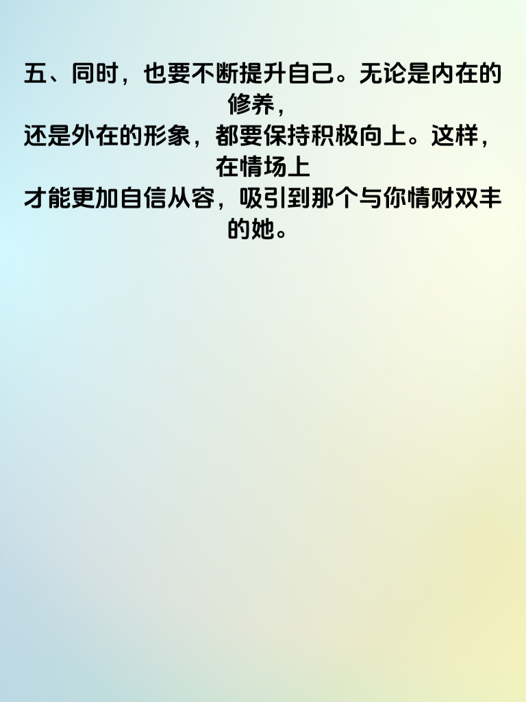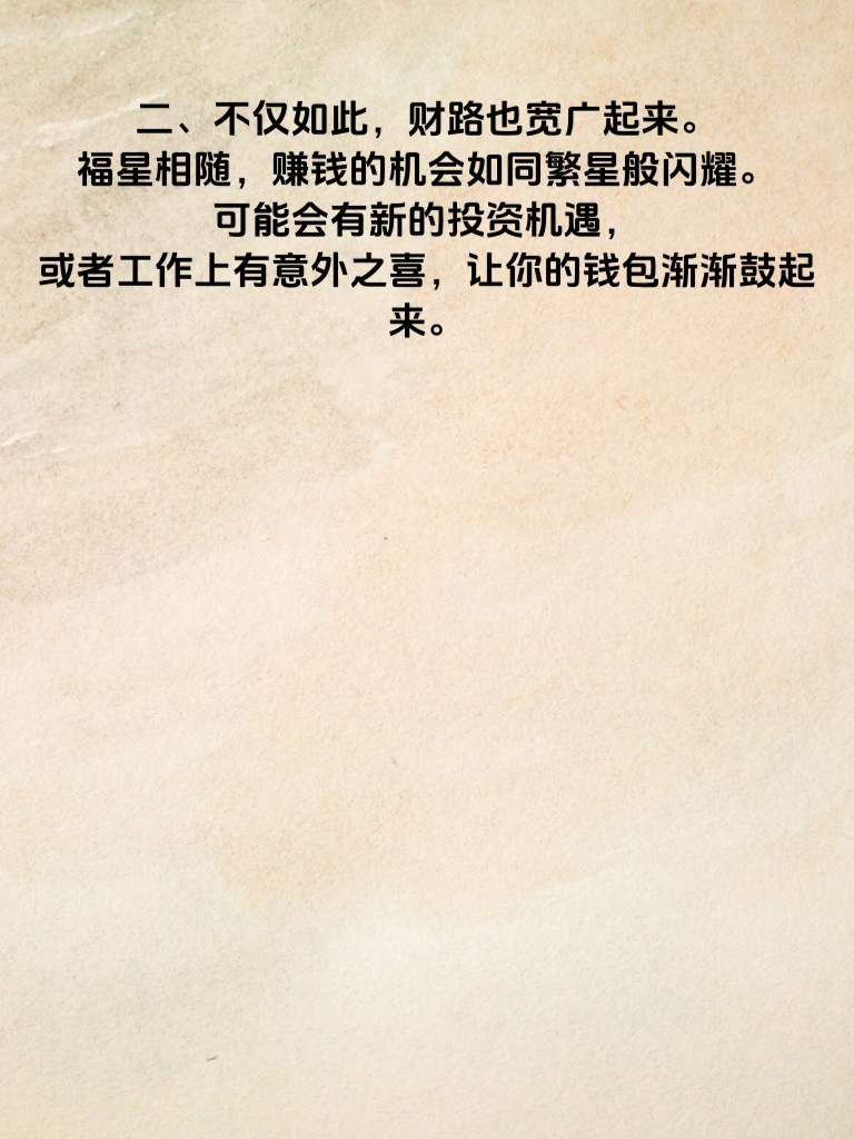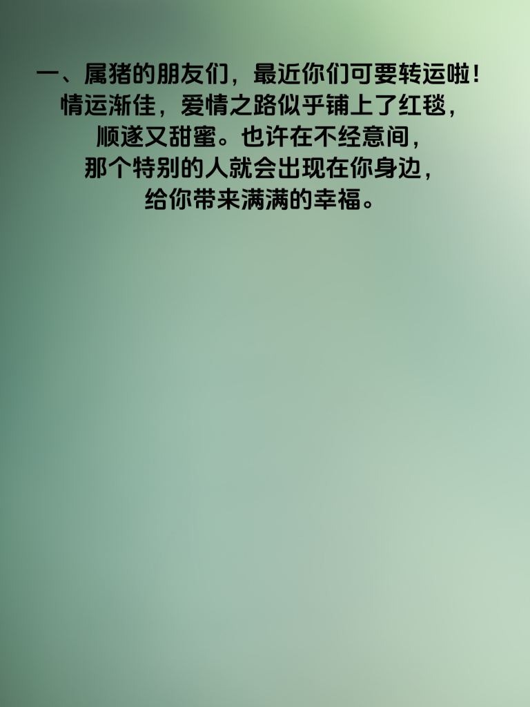 一、属猪的朋友们,最近你们可要转运啦!情运渐佳,爱情之路似乎铺上了红毯,顺遂又甜蜜。也许在不经意间,那个特别的人就会出现在你身边,给你带来满满的幸福。 二、不仅如此,财路也宽广起来。福星相随,赚钱的机会如同繁星般闪耀。可能会有新的投资机遇,或者工作上有意外之喜,让你的钱包渐渐鼓起来。 三、在追求女生方面,属猪的男生们更是要好好把握这难得的运势。真诚是永远的必杀技,用真心去对待心仪的女生,让她感受到你的温暖与可靠。 四、多花时间陪伴她,了解她的喜好,一起去做她喜欢的事情。偶尔准备一些小惊喜,不需要多贵重,只要能表达你的心意。 五、同时,也要不断提升自己。无论是内在的修养,还是外在的形象,都要保持积极向上。这样,在情场上才能更加自信从容,吸引到那个与你情财双丰的她。