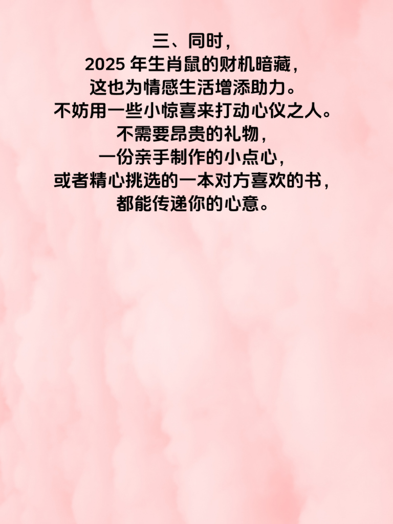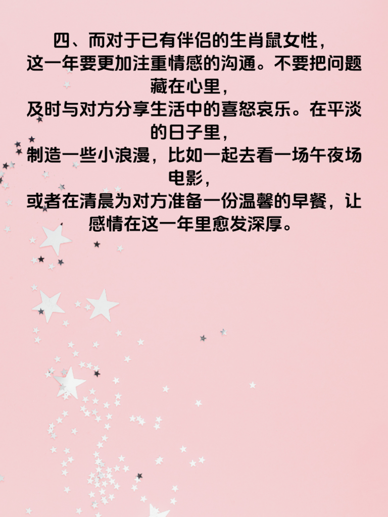 一、生肖鼠的 2025 年,情运微微开启,恰似那春日里初绽的花蕊,带着一丝羞涩与期待。对于单身的生肖鼠女性来说,这一年是邂逅爱情的好时机。要主动走出自己的舒适圈,多参加一些社交活动,扩大自己的交际圈。也许在某个不经意的瞬间,那个对的人就会出现。 二、在与人交往中,生肖鼠的细腻心思能成为独特魅力。学会真诚地倾听对方,适时给予温暖的回应,让对方感受到你的关心与理解。比如,当对方倾诉烦恼时,专注地看着对方的眼睛,轻轻拍拍肩膀表示安慰。 三、同时,2025 年生肖鼠的财机暗藏,这也为情感生活增添助力。不妨用一些小惊喜来打动心仪之人。不需要昂贵的礼物,一份亲手制作的小点心,或者精心挑选的一本对方喜欢的书,都能传递你的心意。 四、而对于已有伴侣的生肖鼠女性,这一年要更加注重情感的沟通。不要把问题藏在心里,及时与对方分享生活中的喜怒哀乐。在平淡的日子里,制造一些小浪漫,比如一起去看一场午夜场电影,或者在清晨为对方准备一份温馨的早餐,让感情在这一年里愈发深厚。