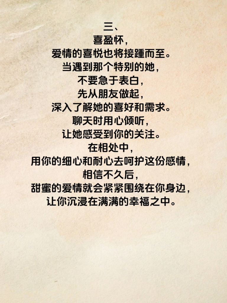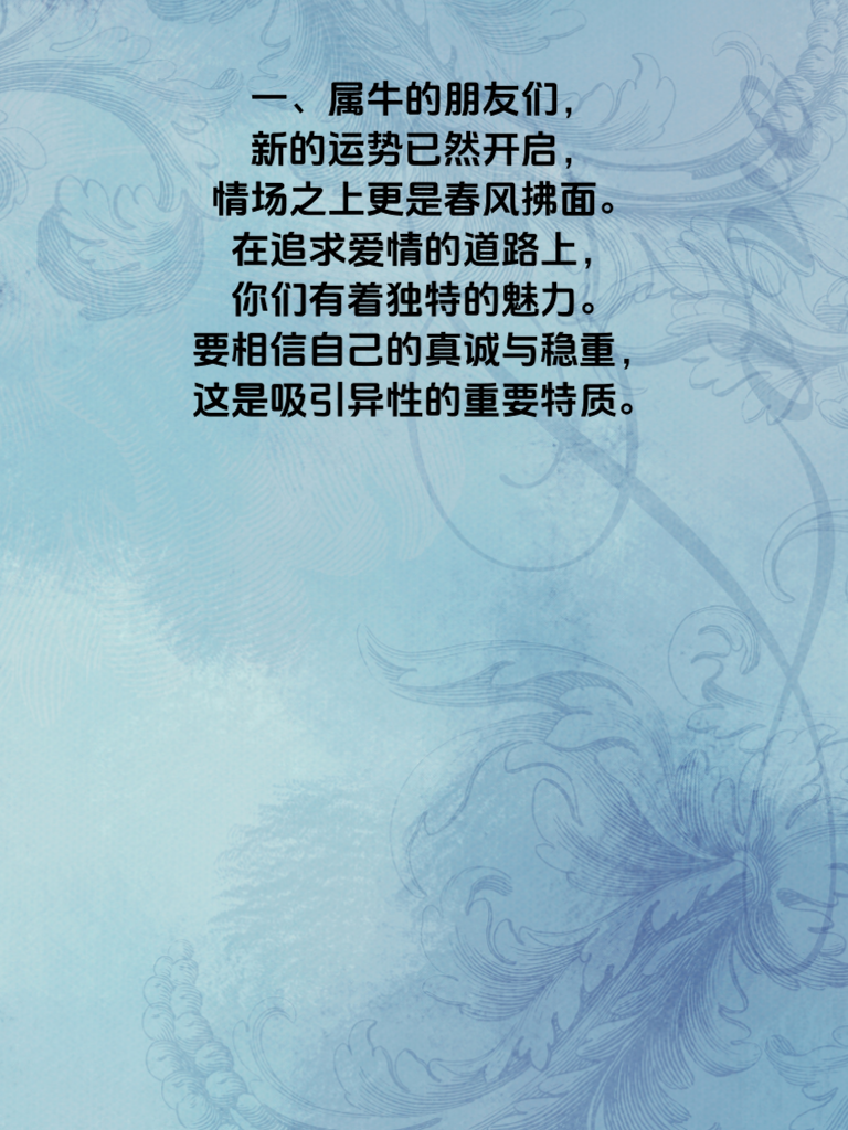 一、属牛的朋友们,新的运势已然开启,情场之上更是春风拂面。在追求爱情的道路上,你们有着独特的魅力。要相信自己的真诚与稳重,这是吸引异性的重要特质。 二、正财稳进,意味着你们在经济上有了一定的底气。这不仅能让自己生活更安稳,也能在与心仪之人相处时,展现出可靠的一面。比如可以偶尔为对方准备一份小惊喜,无需奢华,却能传递心意。 三、喜盈怀,爱情的喜悦也将接踵而至。当遇到那个特别的她,不要急于表白,先从朋友做起,深入了解她的喜好和需求。聊天时用心倾听,让她感受到你的关注。在相处中,用你的细心和耐心去呵护这份感情,相信不久后,甜蜜的爱情就会紧紧围绕在你身边,让你沉浸在满满的幸福之中。