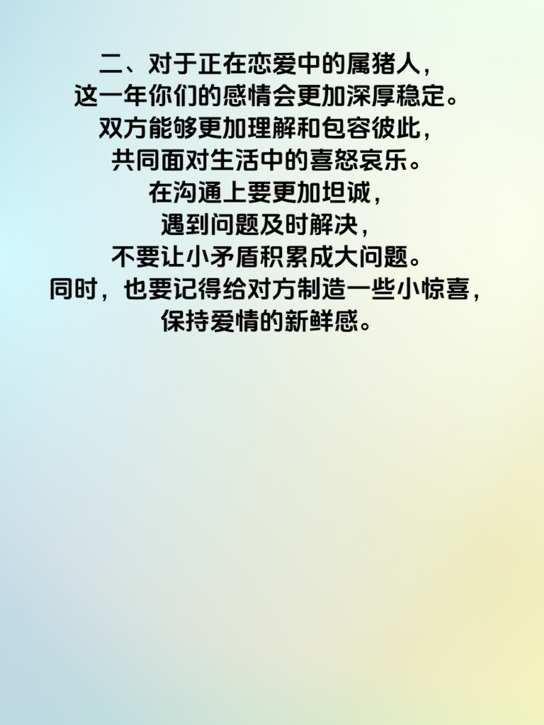 一、属猪的朋友们,2025 年可是你们情运亨通财路顺的好年份哦!在这一年里,爱情运势如同璀璨星辰,为你们照亮寻爱的道路。单身的属猪人,会有许多浪漫的邂逅机会,要勇敢地踏出舒适区,积极参与各种社交活动,展现自己独特的魅力。说不定在某个不经意的瞬间,就能遇到那个与你灵魂契合的人。 二、对于正在恋爱中的属猪人,这一年你们的感情会更加深厚稳定。双方能够更加理解和包容彼此,共同面对生活中的喜怒哀乐。在沟通上要更加坦诚,遇到问题及时解决,不要让小矛盾积累成大问题。同时,也要记得给对方制造一些小惊喜,保持爱情的新鲜感。 三、在财运方面,2025 年属猪人也是顺风顺水。事业上会有不少晋升的机会,只要你们努力工作,发挥自己的优势,就能收获满满的回报。投资理财方面,要保持谨慎,不盲目跟风,根据自己的实际情况做出合理的规划。有了良好的经济基础,爱情也会更加甜蜜,生活也会更加美满。所以,属猪的朋友们,抓住 2025 年的好时机,让情运和财路都一路畅通吧!
