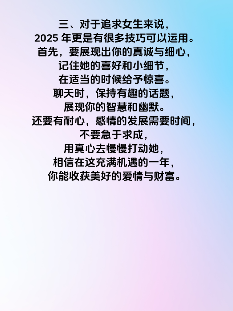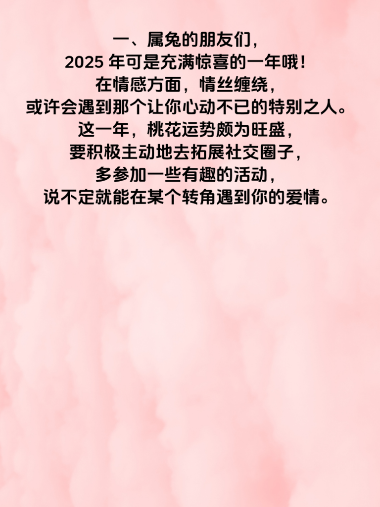 一、属兔的朋友们,2025 年可是充满惊喜的一年哦!在情感方面,情丝缠绕,或许会遇到那个让你心动不已的特别之人。这一年,桃花运势颇为旺盛,要积极主动地去拓展社交圈子,多参加一些有趣的活动,说不定就能在某个转角遇到你的爱情。 二、而在偏财方面,也有着不错的机会。这可能意味着在一些不经意间,会有意外之财降临。比如投资理财上或许会有新的机遇,或者在一些合作项目中能收获额外的收益。但要记住,偏财虽好,也需谨慎把握,不可盲目冲动行事。 三、对于追求女生来说,2025 年更是有很多技巧可以运用。首先,要展现出你的真诚与细心,记住她的喜好和小细节,在适当的时候给予惊喜。聊天时,保持有趣的话题,展现你的智慧和幽默。还要有耐心,感情的发展需要时间,不要急于求成,用真心去慢慢打动她,相信在这充满机遇的一年,你能收获美好的爱情与财富。