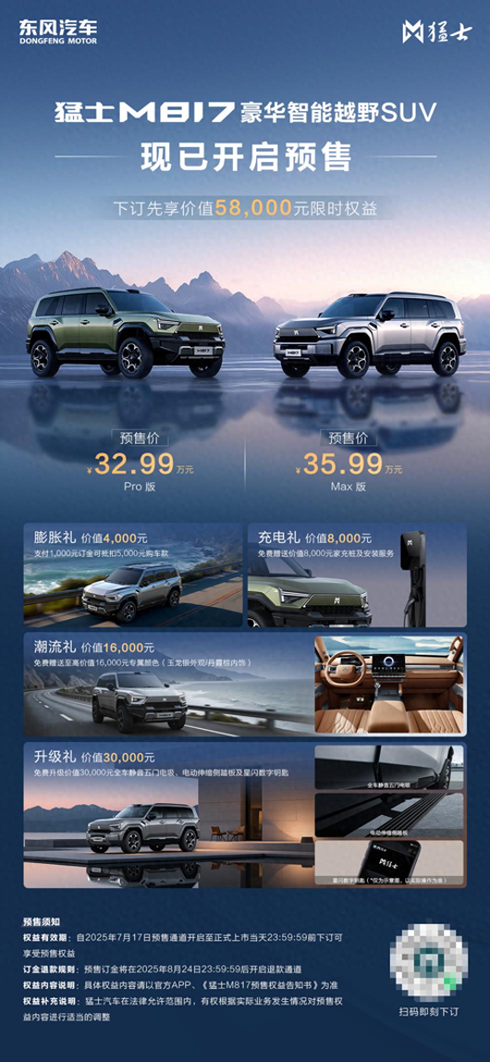 猛士科技表示,猛士M817开创性地将智能科技与越野性能完美结合,为消费者带来全新的用车体验。即日起至正式上市前,预订用户可享受价值58,000元的预售权益。这款产品的推出,不仅丰富了猛士品牌的产品矩阵,更为豪华智能越野市场树立了新标杆。
