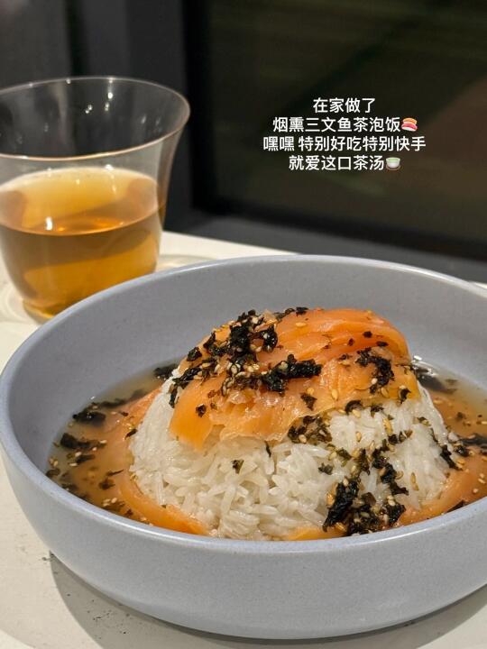 今天在家做了烟熏三文鱼茶泡饭🍵