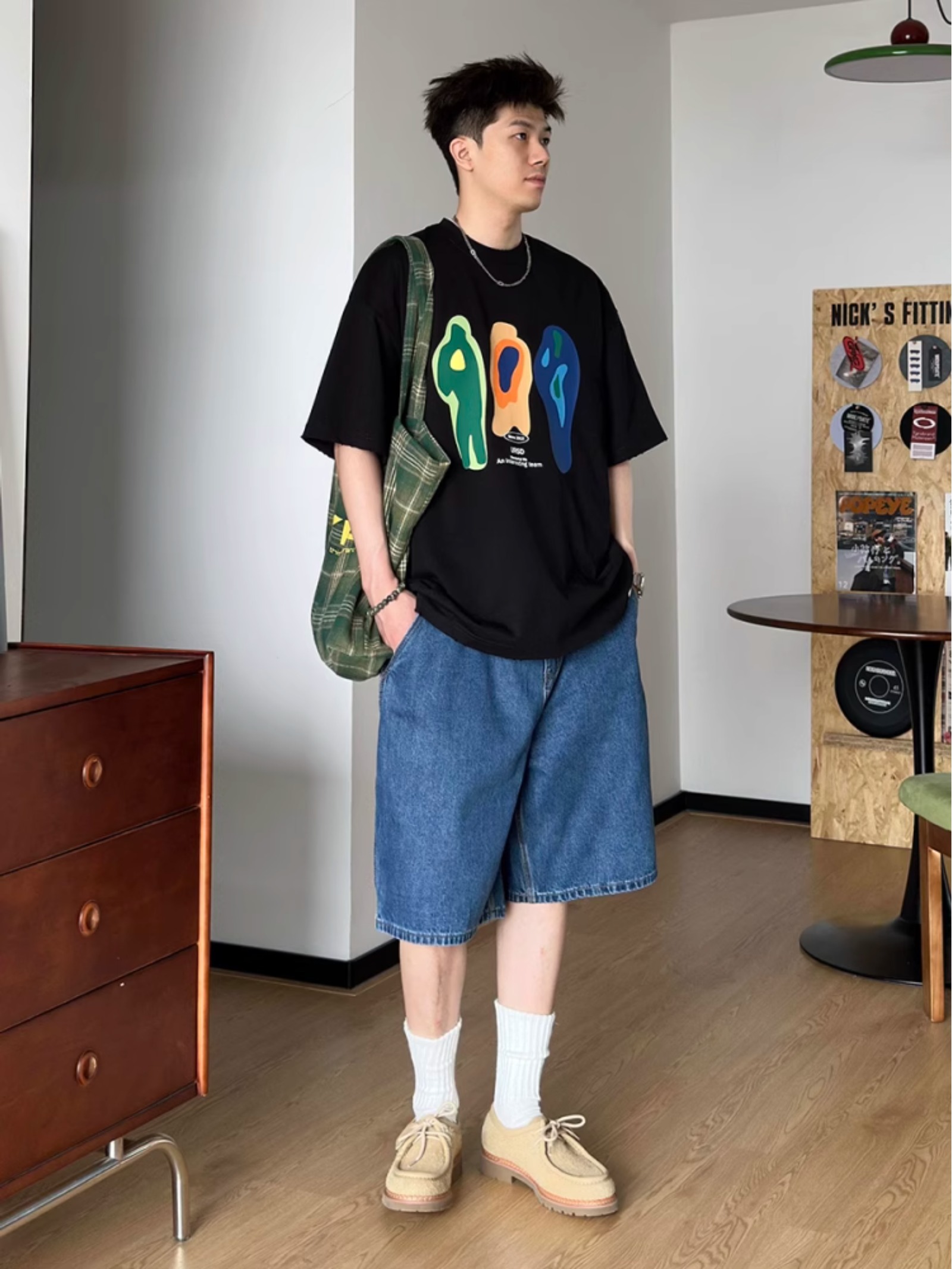 深蓝色牛仔短裤男款夏季宽松水洗直筒男生裤
