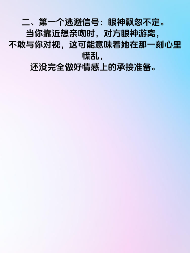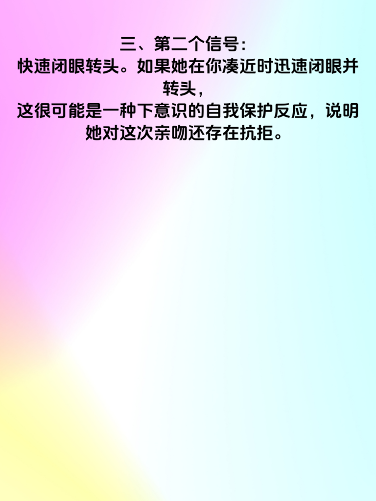 一、接吻本是亲密时刻,可若对方总躲闪眼神,那背后可能藏着未准备好的信号。别小瞧这眼神的回避,它或许在悄悄诉说着内心的犹豫。 二、第一个逃避信号:眼神飘忽不定。当你靠近想亲吻时,对方眼神游离,不敢与你对视,这可能意味着她在那一刻心里慌乱,还没完全做好情感上的承接准备。 三、第二个信号:快速闭眼转头。如果她在你凑近时迅速闭眼并转头,这很可能是一种下意识的自我保护反应,说明她对这次亲吻还存在抗拒。 四、第三个表现:眼神闪躲后刻意拉开距离。她躲开眼神后,身体也不自觉往后退,这表明她在身体语言上也对亲密接触有所抵触。 五、第四个信号:眼神冷淡无期待。没有那种含情脉脉的眼神回应,而是冷淡平淡,那就说明她此刻并没有渴望与你亲吻的热情。遇到这些情况,千万别强行亲吻,不然很可能让局面尴尬甚至破坏感情,要耐心等待合适时机。