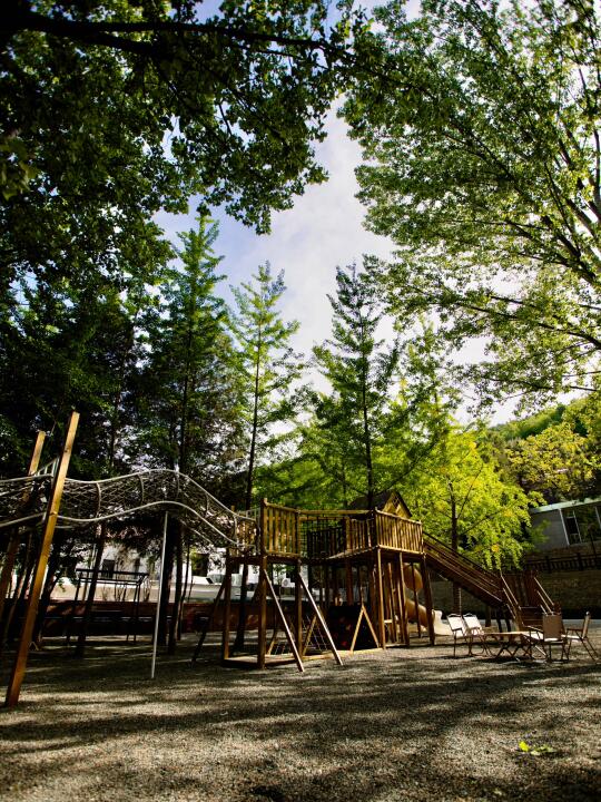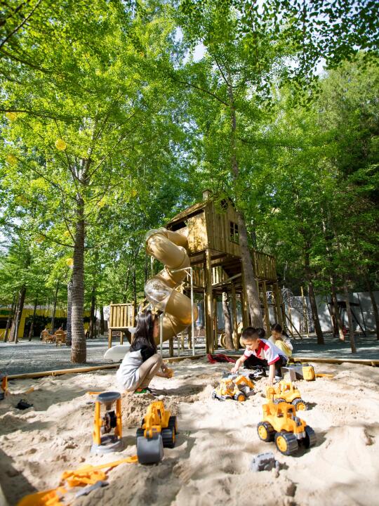 木屋滑梯+白沙池让娃尖叫一整天!沙铲玩具齐全,解放爸妈1小时起步~周围是银杏树林有很多树荫,再也不怕晒成小黑娃~