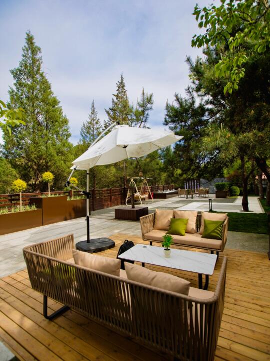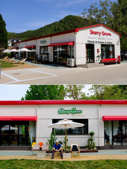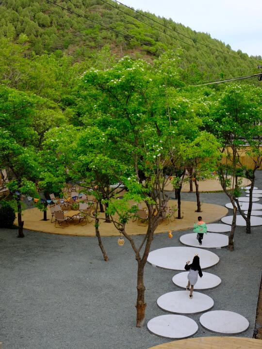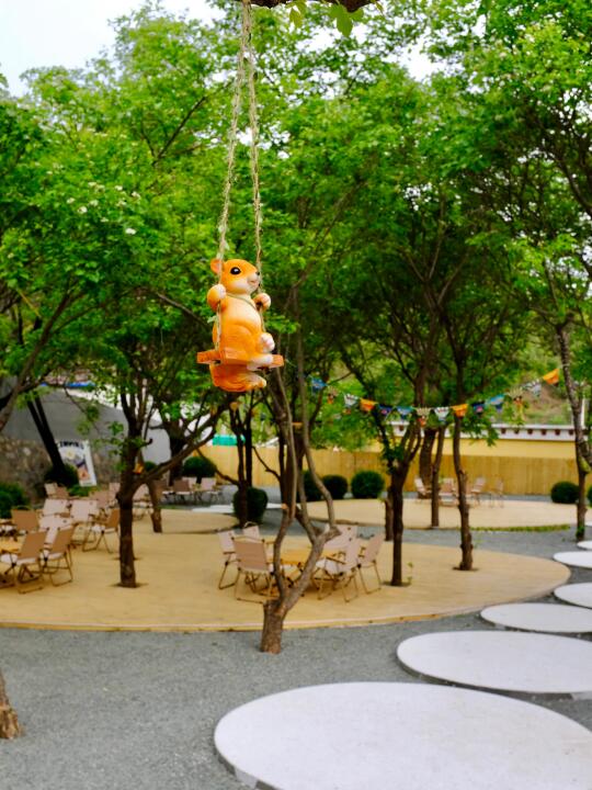 咖啡厅旁边就是下沉山楂林,树影斑驳的休闲区超凉快!躺椅一瘫,来杯度假特调鸡尾酒,风里带着果香,耳边是孩子的欢笑声,这一刻的岁月静好值千金!