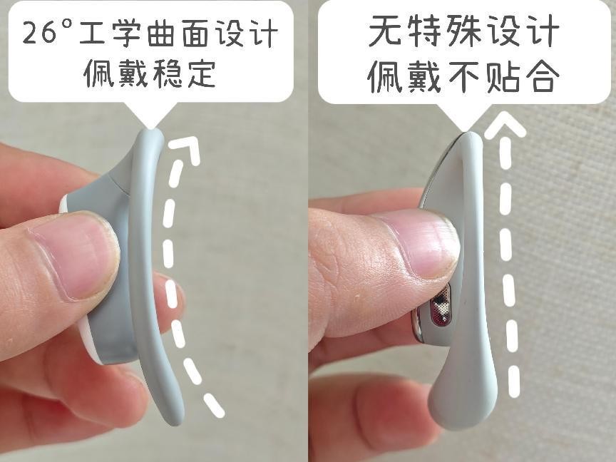 我选择开放式耳机是很看中耳机的佩戴设计的,因为做了特殊的佩戴设计的耳机一般都会更加贴合耳廓提高舒适度和稳定性,例如虹觅的26°工学曲面设计,JBL的四挡可调节耳挂等。而且贴合耳部的开放式耳机,音质也会有一定的提高,因为喇叭传声能够更加精确的传进耳朵里。