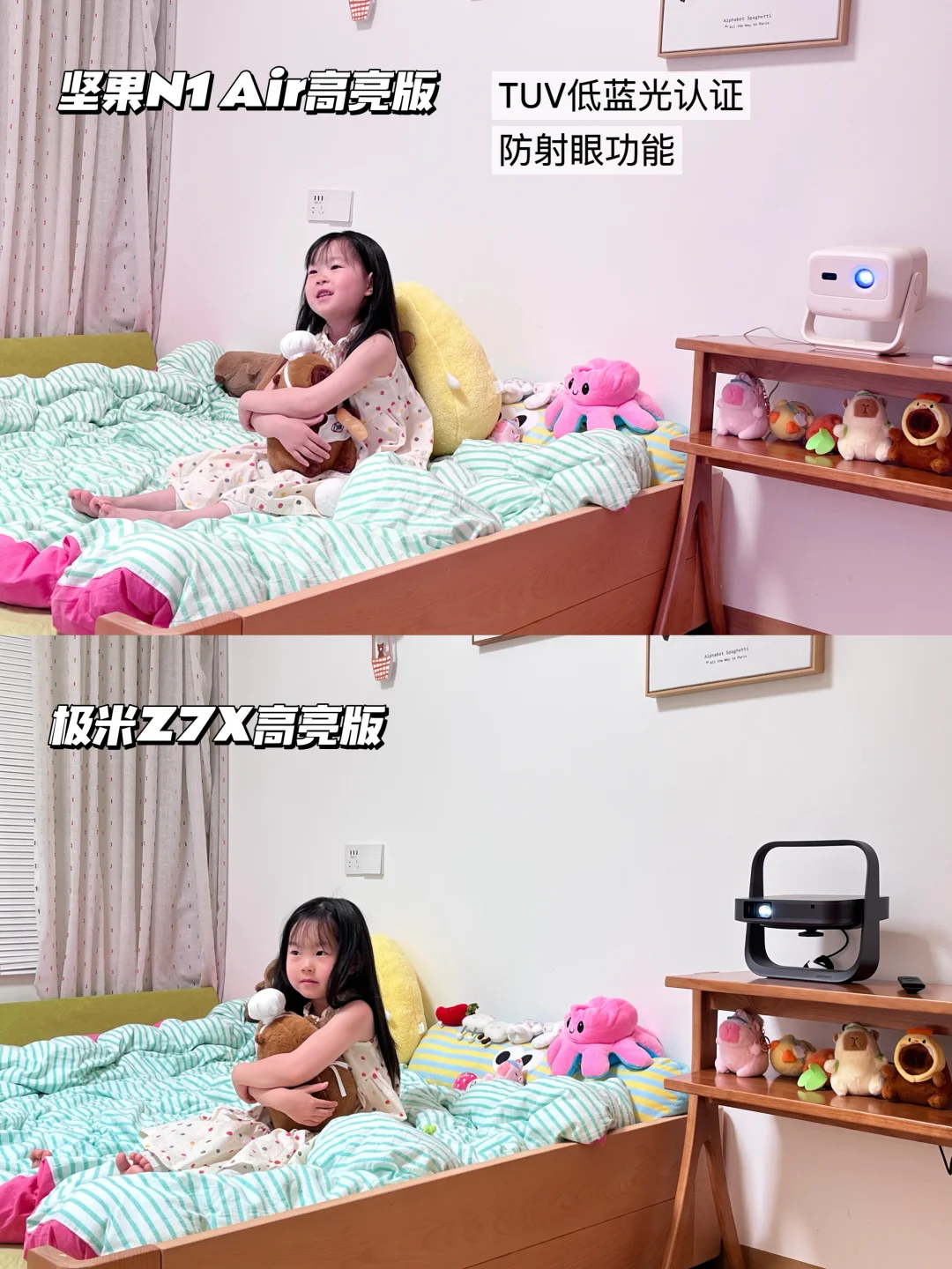 🌈实测完,对两款投影仪的画面质感都挺满意的!因为家里有娃,我自留了坚果N1 Air高亮版!云台很方便,我4岁+的女儿都可以自己操作!而且它的护眼功能也很打动我!有娃家庭618买投影仪可以冲同款哦!
