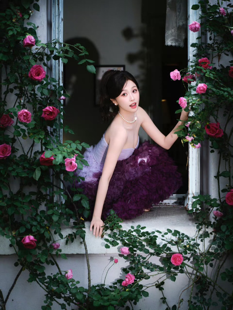 虞书欣 今日活动造型,身穿 Marchesa Notte 渐变抹胸裙,脚踏同色系 Roger Vivier 亮相直播间,珍珠项链点缀颈间,探秘梦境花园的童话欣欣子📸✨