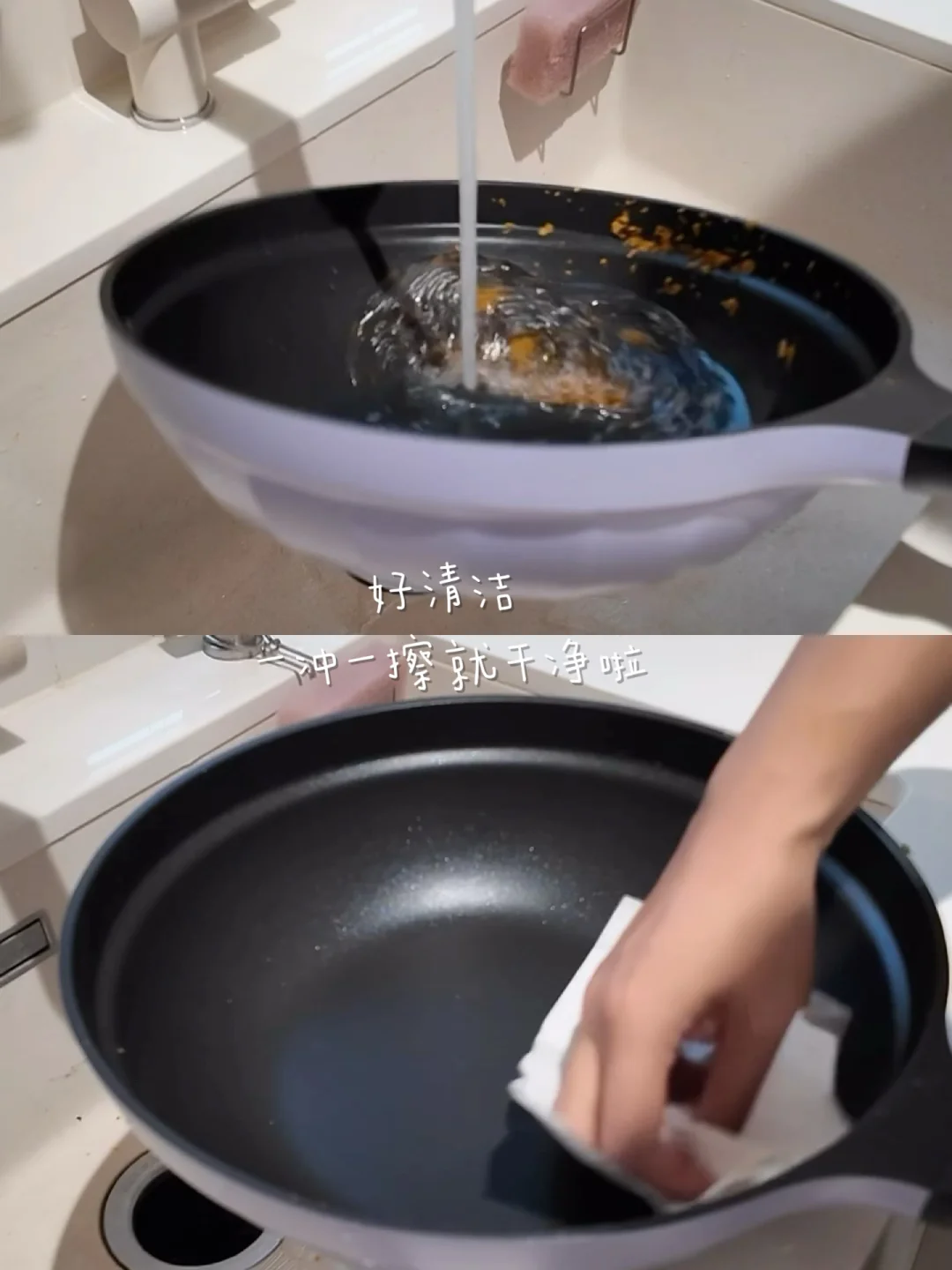 不沾涂层,清洗起来很方便,甚至不需要洗洁精,用水一冲一擦就干净了