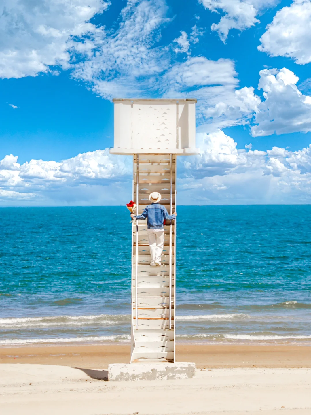 海边有很多类似的白色瞭望台,在“天空之约/恋烟台礼堂”附近就有,长焦拍摄效果更佳
