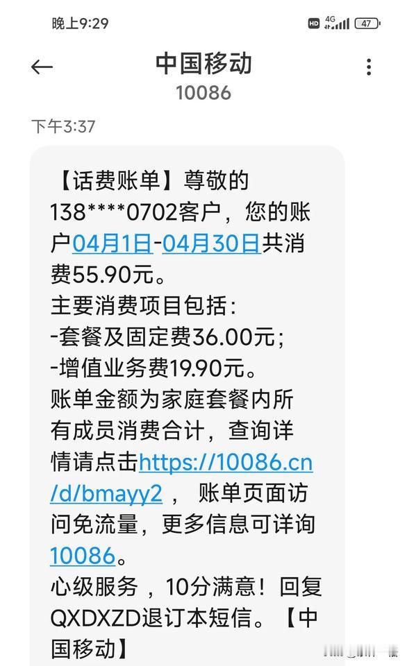 中国移动是不是想钱想疯了? 今晚我翻看移动下午3:37发来的账单短信时,发现多扣了一项“增值业务费19.9元”。(图一)这让我一头雾水。 我赶忙拨打10086想问个明白。 客服说我订了个彩铃,可我表示自己并没有订。客服便说相信我没订,还问我有什么诉求。 当时我很气愤地回答:“你们把多扣的钱退回来,并且查清原因给我个交代,不然我就报警了。” 客服赶忙回答:“您别报警,我把钱退给您。”(图二) 我在此呼吁中国移动的领导,这种情况是如何产生的?请给个解释。 网友们,要是你们碰到这样的事会怎么处理呢?同时提醒大家每个月查看一下话费。中国移动 移动套餐陷阱