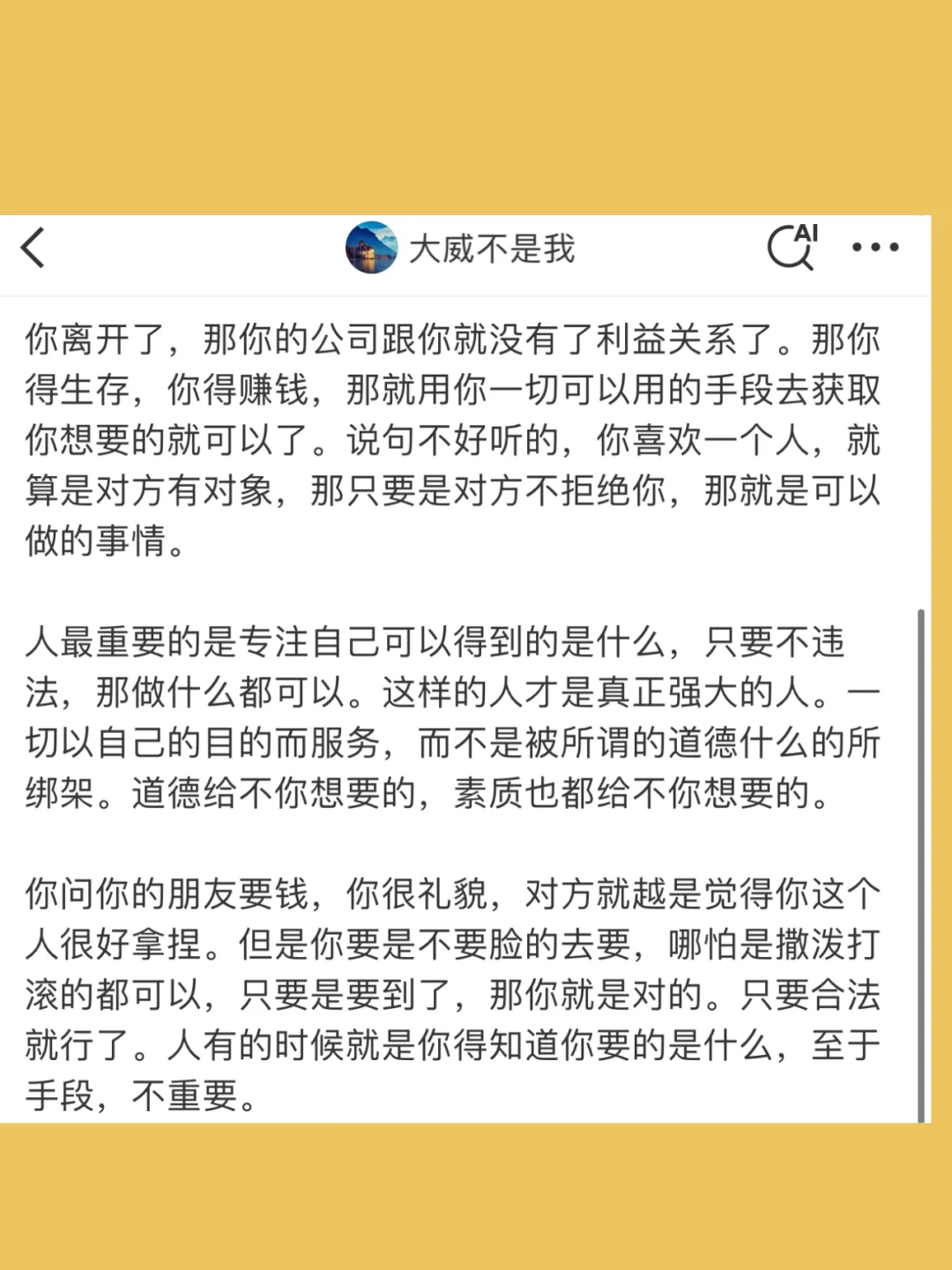强大是什么? 强大就是我不在乎你是不是有对象,我只在乎自己想要得到的是什么。 就跟你抢你公司的客户一样,你不在乎这是你前公司的客户,你就只在乎你是不是可以抢到你手里而已。要是你可以抢到,那就是你自己的。你要是抢不到,那就是别人的。本质上就是竞争而已。 没有必要觉得这不好什么的。也没有必要觉得别人之前对我好就不敢干了。对你好的本质就是为了让你好好的干活而已,给你工资不过就是遵守合同而已。不要把这些东西混在商业上,没什么意思。 你离开了,那你的公司跟你就没有了利益关系了。那你得生存,你得赚钱,那就用你一切可以用的手段去获取你想要的就可以了。说句不好听的,你喜欢一个人,就算是对方有对象,那只要是对方不拒绝你,那就是可以做的事情。 人最重要的是专注自己可以得到的是什么,只要不违法,那做什么都可以。这样的人才是真正强大的人。一切以自己的目的而服务,而不是被所谓的道德什么的所绑架。道德给不你想要的,素质也都给不你想要的。 你问你的朋友要钱,你很礼貌,对方就越是觉得你这个人很好拿捏。但是你要是不要脸的去要,哪怕是撒泼打滚的都可以,只要是要到了,那你就是对的。只要合法就行了。人有的时候就是你得知道你要的是什么,至于手段,不重要。 要债就是你知道你要的是你的钱,至于所谓的关系什么的都不重要。关系也都当不了饭吃。素质这东西对于有素质的人有用,对于没素质的人没用。 一个人在公司里不敢拒绝同事的需求,一切都是以同事的需求为主,那你的工作内容肯定得加班做完。你要是以你自己的工作内容为主,敢于拒绝你的同事的请求,那就是你知道你要的是什么。 当一个人知道了自己要的是什么,那么你就会有自己的目标。你也知道你打工不是为了交朋友的,你是为了赚钱的。你越是早认识到就越好,否则是不可能有一个好的结果的。 赚钱是确定性的,又或者说是可控的。哪怕是赚的不多,那你也不用为了讨好人而花费很多的金钱和精力。至于你有多少个朋友,有多少人是你的朋友,那不是取决于你,而是取决于你的价值。 你的价值低,那很多所谓的朋友都不是朋友。都是酒友。都是希望你好但是你不要比我好的人。当然了,我在出社会的时候并没有意识到,那个时候也有人告诉我,没听。但是经历了很多事情之后发现这是对的。 事实上,很多事情你只有去经历了才知道,你不经历别人告诉你的你都以为不重要。人这种动物,就只有吃亏了上