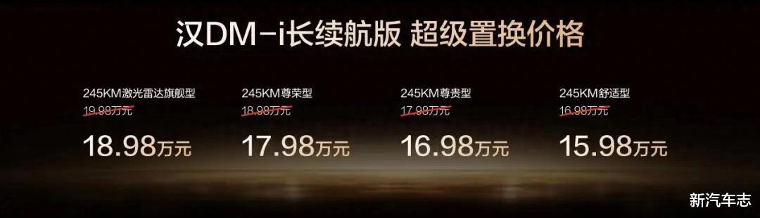 此次,汉DM-i长续航版共推出4款车型,补贴后售价15.98万~18.98万元;汉EV长续航版共推出3款车型,补贴后售价17.38万~20.58万元(10月31日前完成购车可享1万元超级置换补贴)。同时,比亚迪还为用户准备了包含置换补贴在内的至高价值3.8万元七大礼遇。