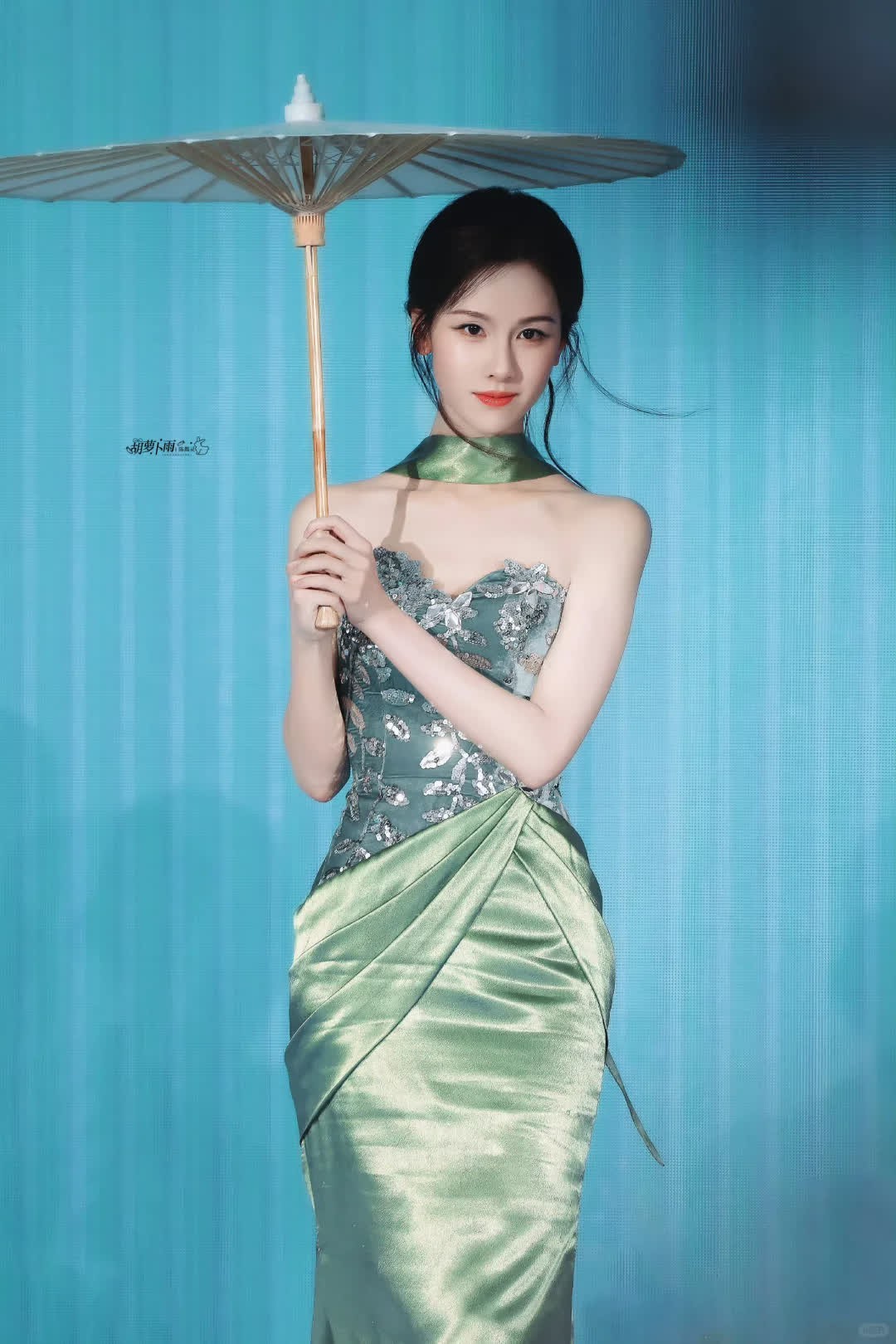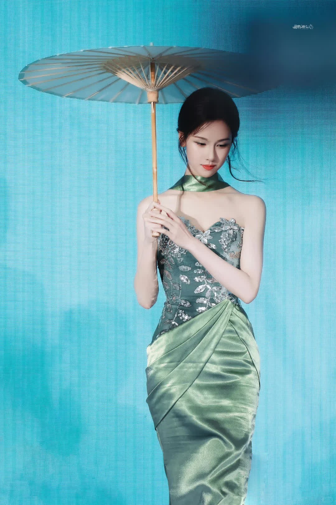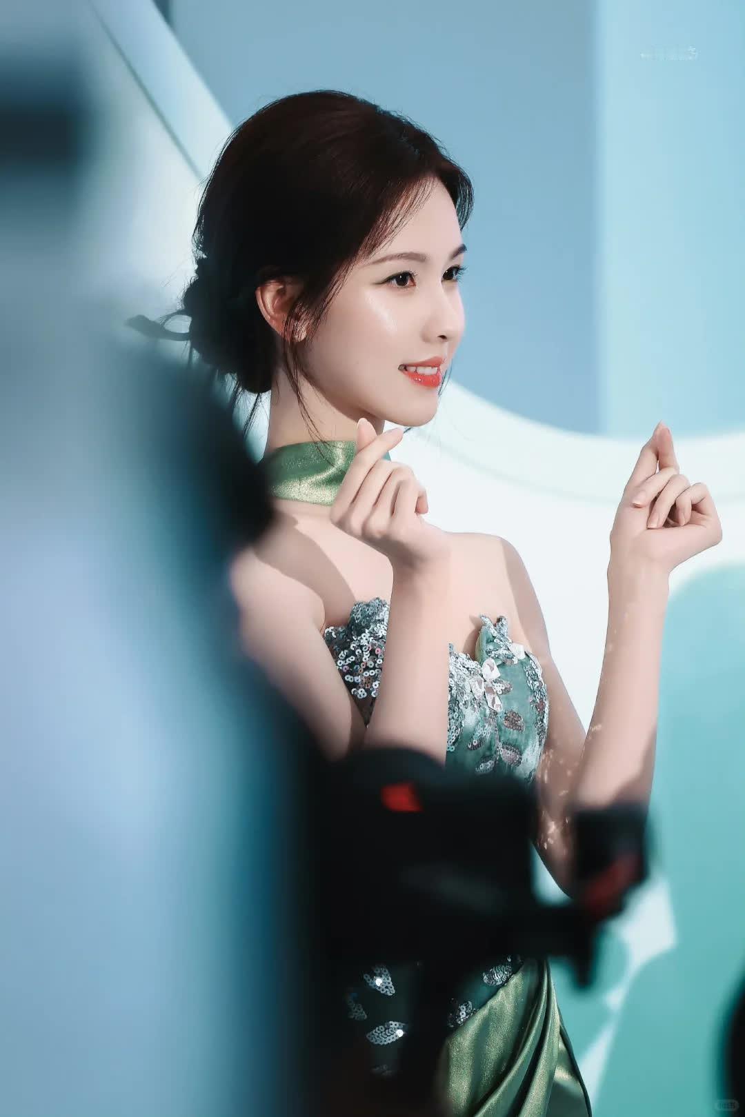 陈都灵今日活动穿搭,上身绿色新中式礼服,妆造和礼服好搭,好美好有气质,她和绿色系就是绝配💚
