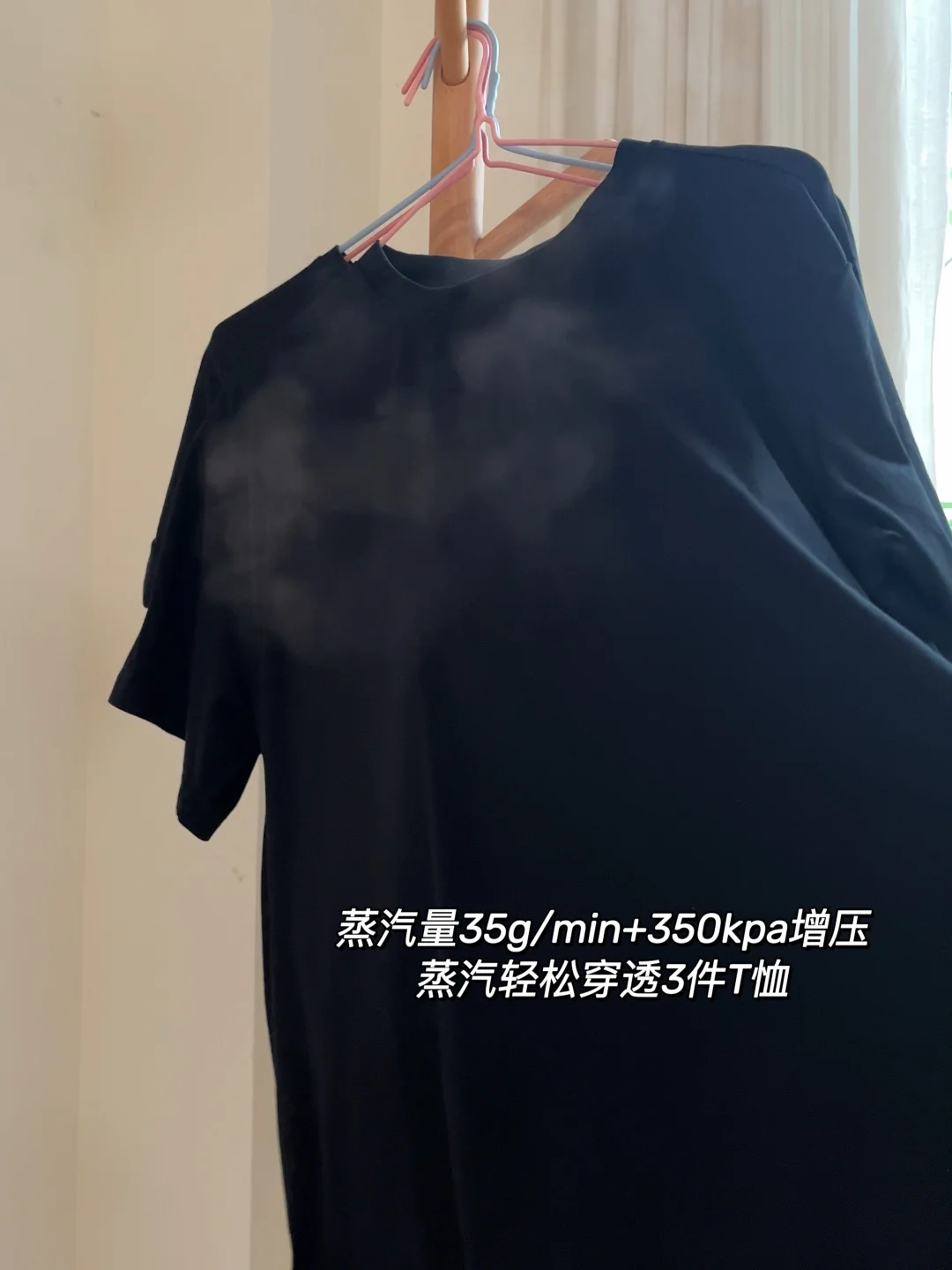 蒸汽量足足有35g/min,还有350kPa的增压,比普通熨烫机强太多了!再厚的衣服蒸汽也能轻松穿透,一熨过去,皱巴巴的厚外套瞬间被熨平整了!