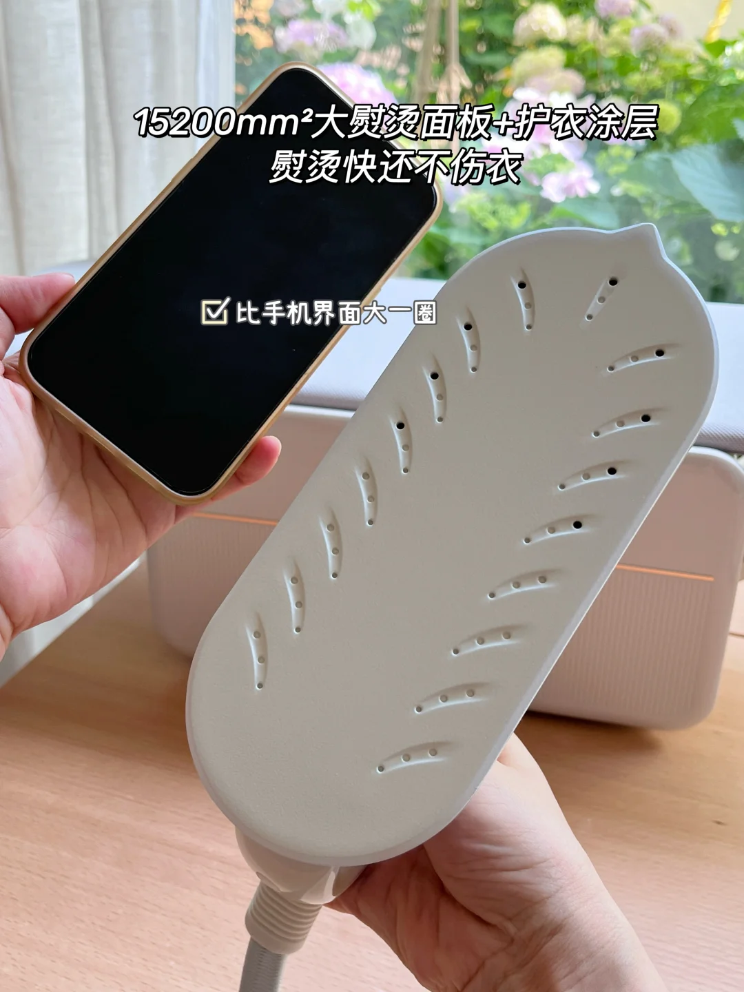 15200mm²大熨烫面板比我旧的手持挂烫机大一圈!以前用手持挂烫机熨烫一件衬衫要5分钟,它1-2分钟就烫好了!还带陶瓷油护衣涂层,熨得快还不伤衣服!