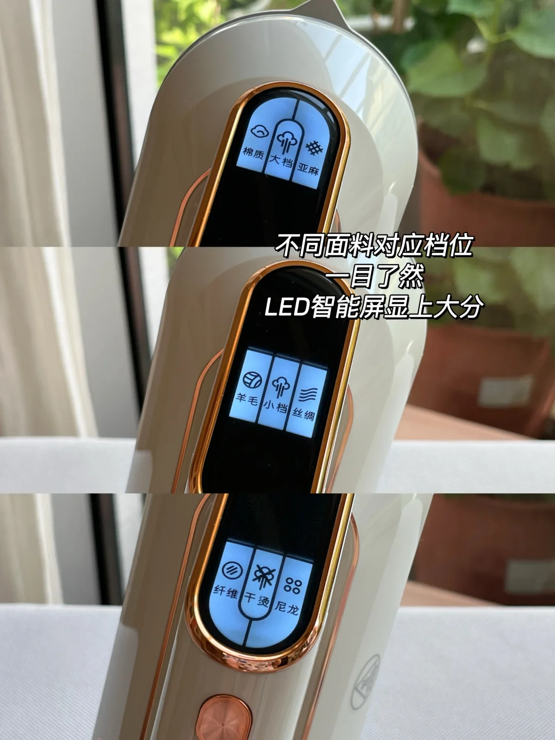 👉LED智能屏显这个设计太懂用户了,什么档位适合熨什么面料,一目了然!丝绸/棉质/羊毛🦙等不同面料都能直接对应图标找到适配档位,傻瓜式操作超省心!不用像以前熨不同面料还要翻说明书调档位。