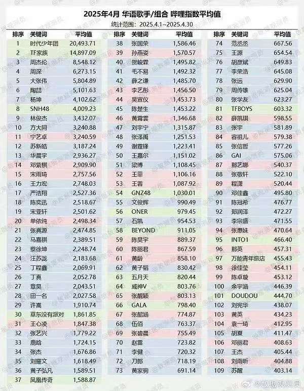 苏新皓,2025年4月华语男歌手哔哩指数TOP8;华语歌手/组合哔哩指数平均值TOP12;2025年4月华语歌手/组合百度搜索指数平均值TOP9;华语男歌手2024全年哔哩指数平均值TOP10。