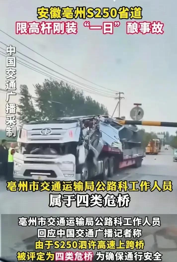 省道限高2.5米你没听说过吧,据报道安徽毫州因桥有安全问题,把S250道设置了限高2.5米,刚安装上第一天就出了问题,这是谁的错? 我个人认为,标识可能有,应该是不显眼,这不只是限道路高度,最重要的是限自己一生权职高度,可能幼儿园小朋友都知道限高后的严重性。出了问题,赔偿应该主管领导出部分,因为是你们批准的,大家说对不对?