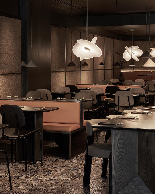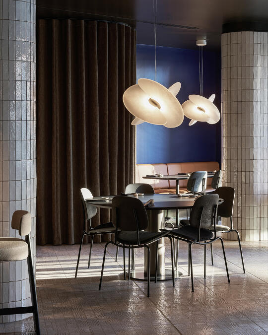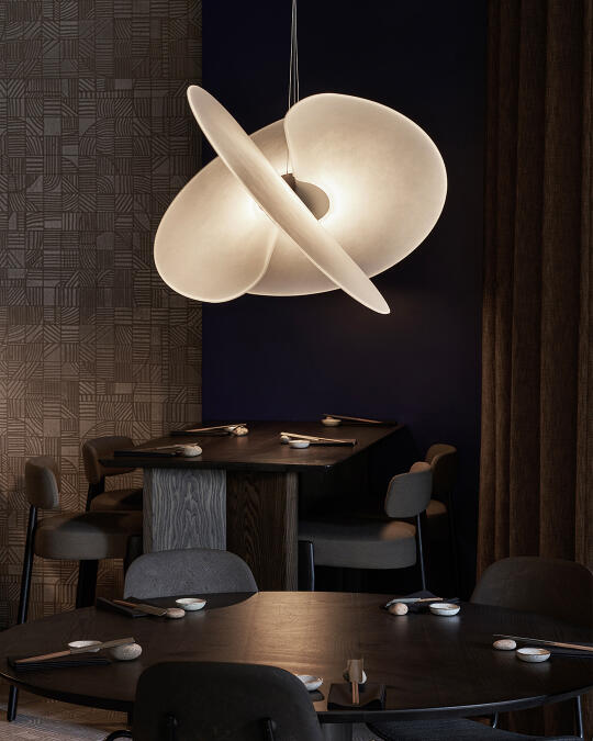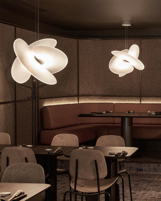 而最打动我的,是头顶那一盏盏 Levante 吊灯 ——出自 之手,如风拂过水面的柔光,为整个空间注入一种流动的节奏与艺术的诗意。
