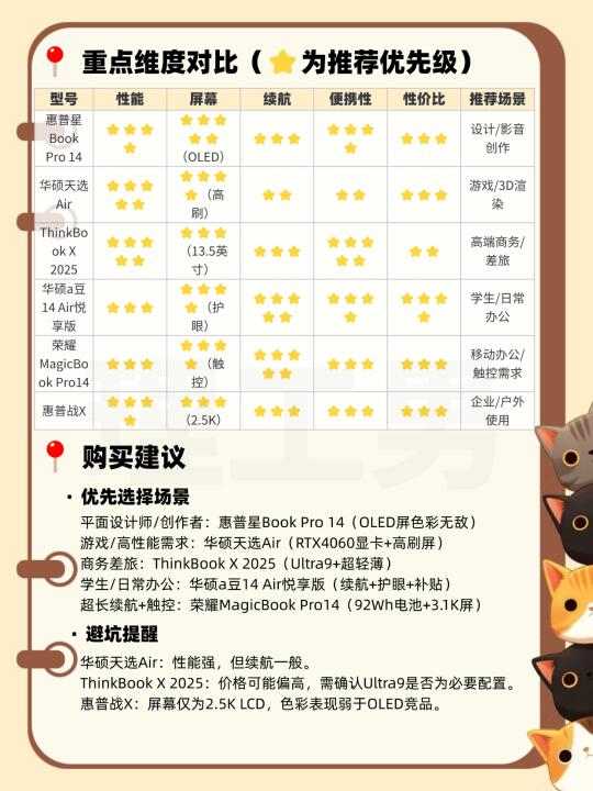 姐妹们!2025年轻薄本真的太卷啦~今天给大家种草6款颜值爆表、性能抗打的轻薄本,学生党、上班族、设计师闭眼冲!👇 1️⃣ 惠普HP星Book Pro 14 2025 亮点:2.8K OLED 120Hz屏+Ultra5 AI处理器+32G大内存 OLED屏色彩绝绝子!剪视频、修图自带「滤镜感」,AI加速让办公效率翻倍。1.44kg金属机身,图书馆赶论文/咖啡馆办公都能轻松塞进包包。 适合:设计师、影音党、追求屏幕体验的宝子! 2️⃣ 华硕天选Air 14英寸 亮点:RTX4060显卡+R7-8845H+165Hz高刷屏 轻薄本也能打游戏!3A大作流畅不卡顿,建模渲染无压力,机身仅1.46kg。高刷屏追剧超丝滑,学生党宿舍开黑神器。 适合:游戏玩家、理工科学生、3D设计党! 3️⃣ ThinkBook X 2025商务本 亮点:Ultra9处理器+13.5英寸超薄机身+军工级耐用 商务精英必备!指纹解锁+防泼溅键盘,出差开会安全感拉满。续航12小时,飞机上也能码完PPT,接口齐全不用带转接头。 适合:高管、差旅党、极简风爱好者! 4️⃣ 荣耀MagicBook Pro14 AI 亮点:3.1K触控屏(选配)+92Wh超大电池+U5处理器 续航天花板!满电撑一天不用充电,触控屏手写笔记超方便,学生党上网课做标注超实用。银白机身颜值超高,图书馆吸睛利器。 适合:学生党、移动办公族、触控需求党! 5️⃣ 华硕a豆14 Air悦享版 亮点:AMD R9+17小时续航+2.5K护眼屏 国家补贴20%!续航从早八撑到凌晨,护眼屏码字不累眼,1.39kg塞进帆布包无压力。性价比之王。 适合:学生党、文字工作者、预算党! 6️⃣ 惠普战X 2025 亮点:Ultra7处理器+军工认证+2.5K防眩光屏 户外党狂喜!防摔防尘防水,工地咖啡馆随意切换。接口超全,插U盘投影仪不用转接,程序员/工程师的移动工作站。 适合:工程师、户外工作者、企业采购!