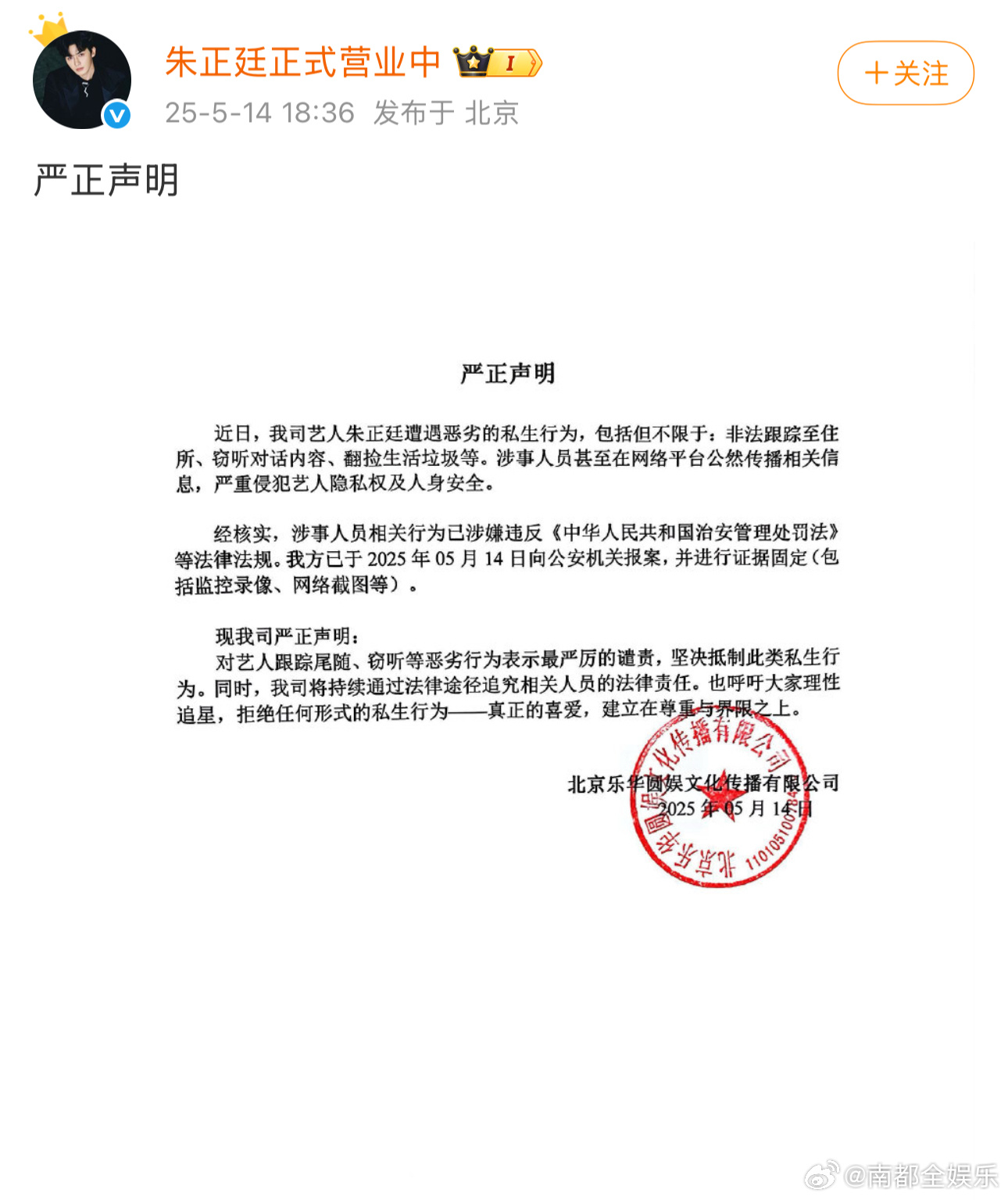 朱正廷工作室发文朱正廷发文怒斥私生今日,发文怒斥私生,指出有三名私生在他新家家门口晃悠、翻垃圾,种种行为不仅被朱正廷家人发现,还被“摄像头拍的清清楚楚”。朱正廷还在评论区表示已留存视频资料并报警,还将在家周围再装一圈无死角的监控。随后,朱正廷工作室也发布严正声明,喊话私生:“坚决抵制此类私生行为。同时,我司将持续通过法律途径追究相关人员的法律责任。也呼吁大家理性追星,拒绝任何形式的私生行为。”