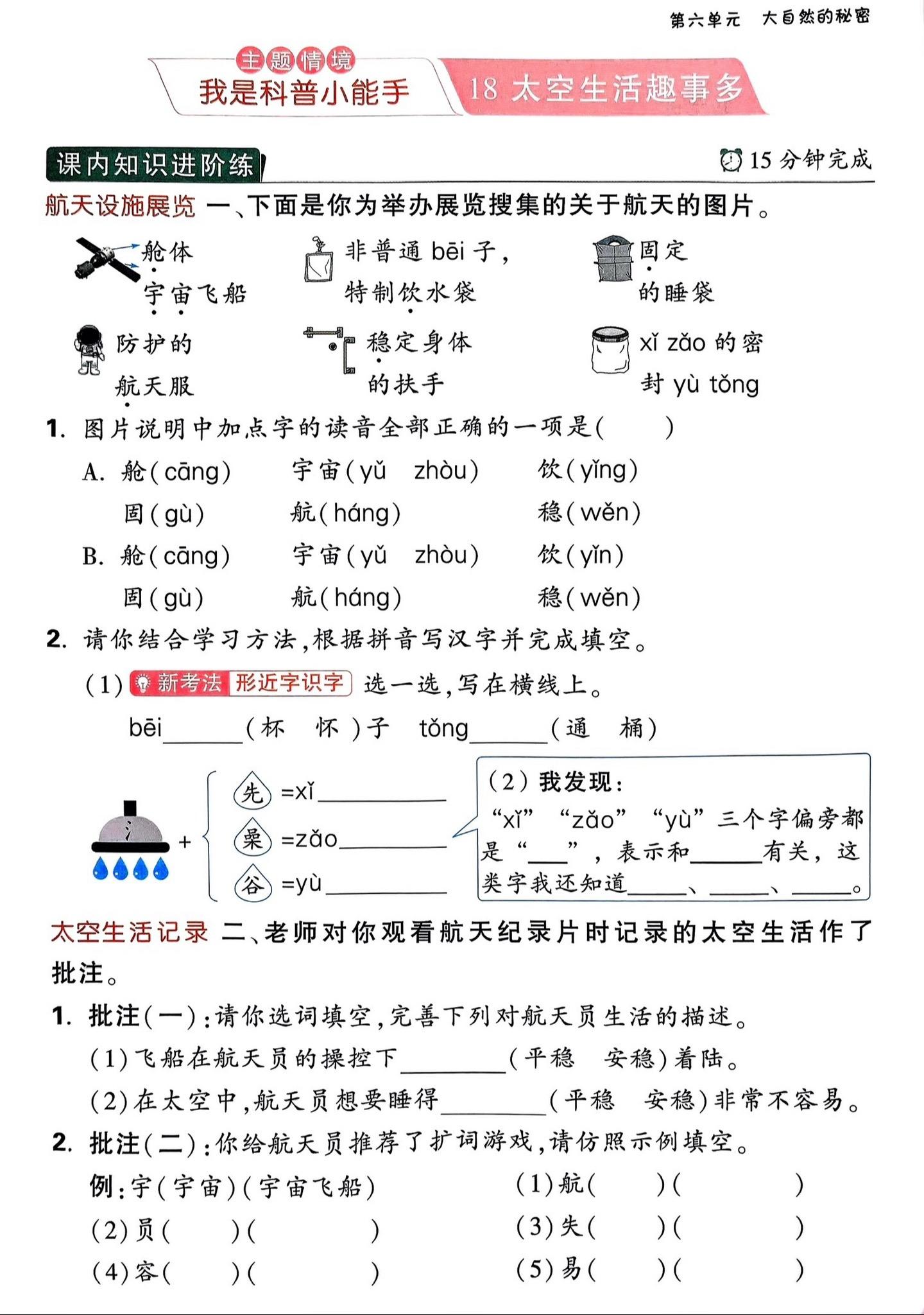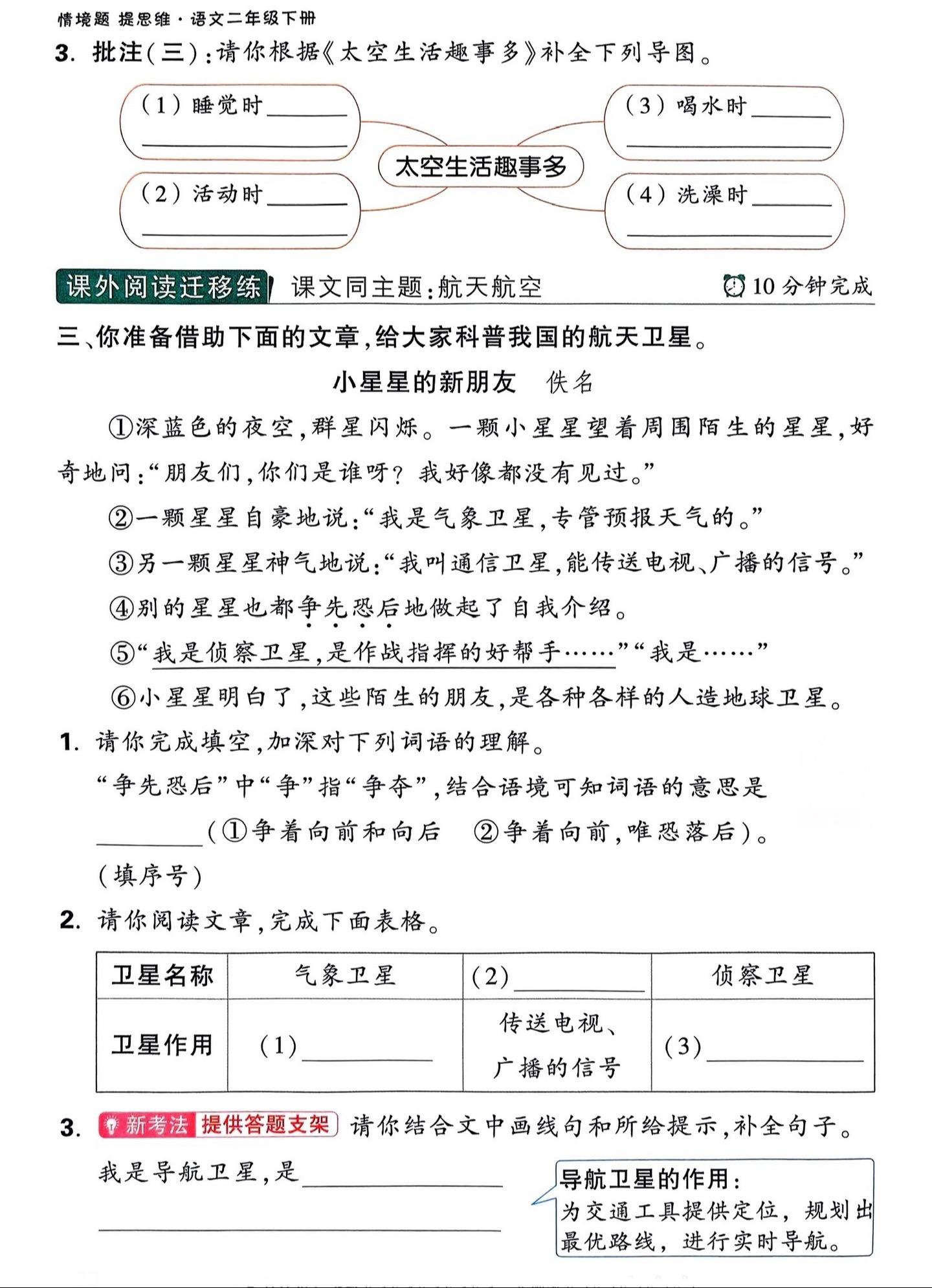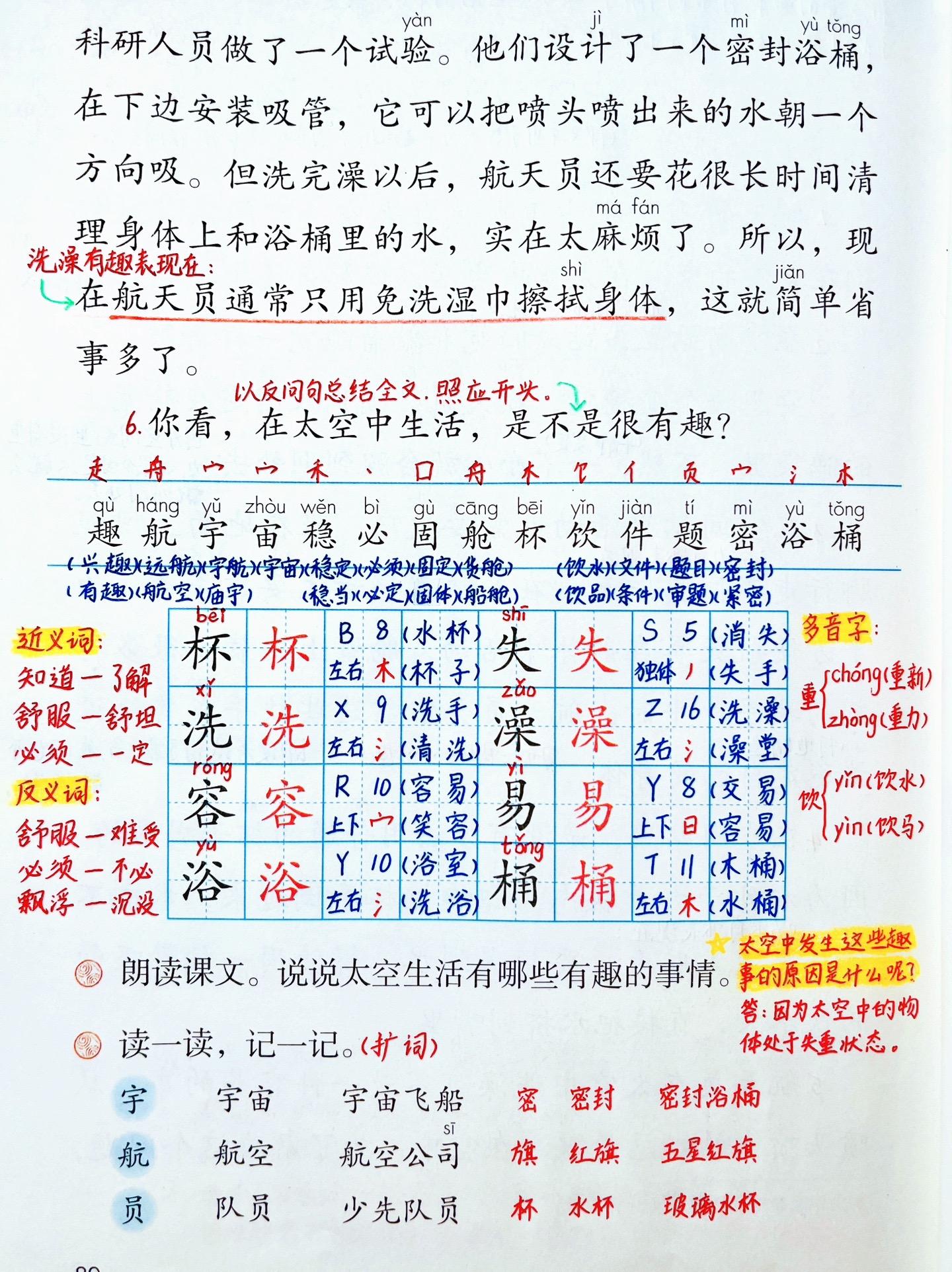 二年级下册《太空生活趣事多》笔记。文中共写了四件趣事。一是睡觉的趣事,为了不飘到别处去,要钻入固定在舱壁上的睡袋里;二是活动的趣事,航天员需要依靠舱壁上的特制扶手或其他设施来稳定自己的身体;三是喝水的趣事,为了喝到水,要用一种带吸管的饮水袋,直接把水挤到嘴里;四是洗澡的趣事,为了让水冲下来,科研人员设计了一个密封浴桶,但由于航天员在洗完澡后需要花很长时间清理,现在通常使用免洗湿巾擦拭身体。