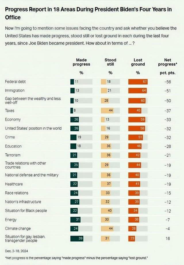 万万没想到,美国人民也开始“凡尔赛”了!说好的灯塔国,结果一调查,大家纷纷表示:这几年,我们“退步”了!这是咋回事?原来,最近有调查显示,不少美国人觉得,在拜登执政的这段时间里,美国在经济、民生等方面,没啥实质性进展。 具体来说,美国人对这几件事儿意见比较大:债务高筑、贫富差距拉大、移民问题严重,还有国际地位下降等等。但也有人觉得,同性恋、双性恋、跨性别群体的处境变好了。 其实,美国老百姓的感受,跟党派立场关系很大。民主党觉得还行,共和党就觉得不行。不过,跟之前的总统相比,拜登这届政府,好像“差评”更多一些。 说到这儿,我得插一句,美国的政治,那真是一出大戏。两党互相拆台,政策变来变去,老百姓的日子,也跟着忽上忽下。就拿债务问题来说吧,两党吵来吵去,最后苦的还是老百姓。还有移民问题,更是个老大难。 现在,美国社会撕裂严重,大家各说各的理。想要弥合这些分歧,恐怕不是一朝一夕的事儿。 话说回来,美国人觉得“退步”了,咱们也不能幸灾乐祸。毕竟,每个国家都有自己的问题。关键是,我们要做好自己,把自己的日子过好。只有这样,才能在国际舞台上更有底气!