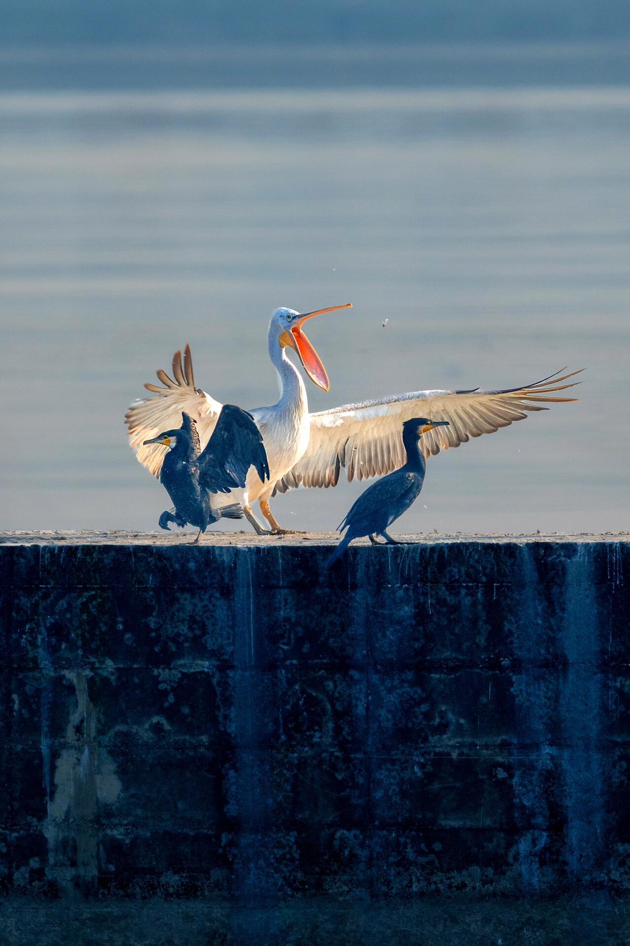 初见卷羽鹈鹕,最引人注目的当属它那标志性的喉囊。这个能容纳13升水的巨型“活兜”,展开时如同随身携带的折叠渔网,配合尖锐的喙部,瞬间就能将成群的鱼虾“收入囊中”。每当它在水面划动宽大的翅膀,喉囊便像灵活的捕虫网般迅速下探,眨眼间就能兜住半米深的水和猎物。更神奇的是,卷羽鹈鹕还会与同伴组成“捕鱼联盟”,它们在水面排成半圆形,用翅膀拍打水面制造声势,将惊慌逃窜的鱼群驱赶到狭小区域,再集体张开喉囊大快朵颐,这种默契配合的“战术捕鱼”,堪称湿地版的“围猎盛宴”。