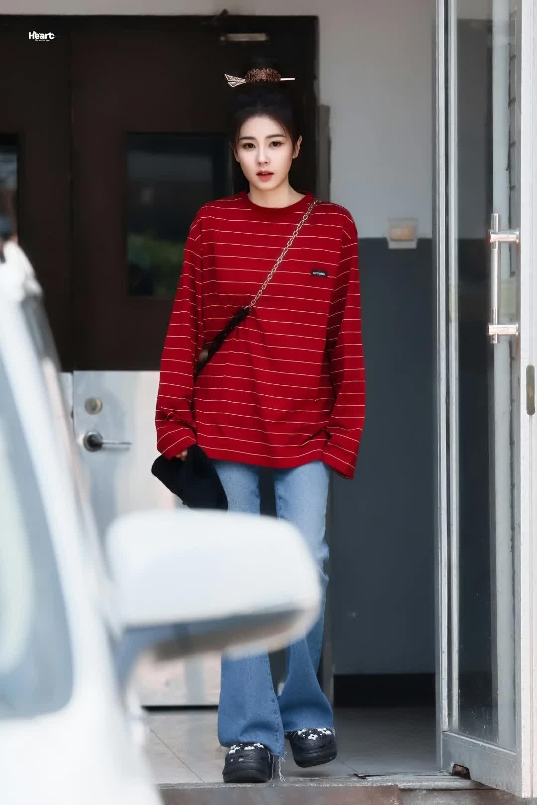 一身红色条纹长袖 微喇牛仔裤 洞洞鞋