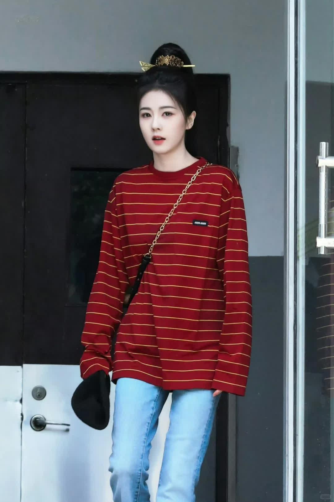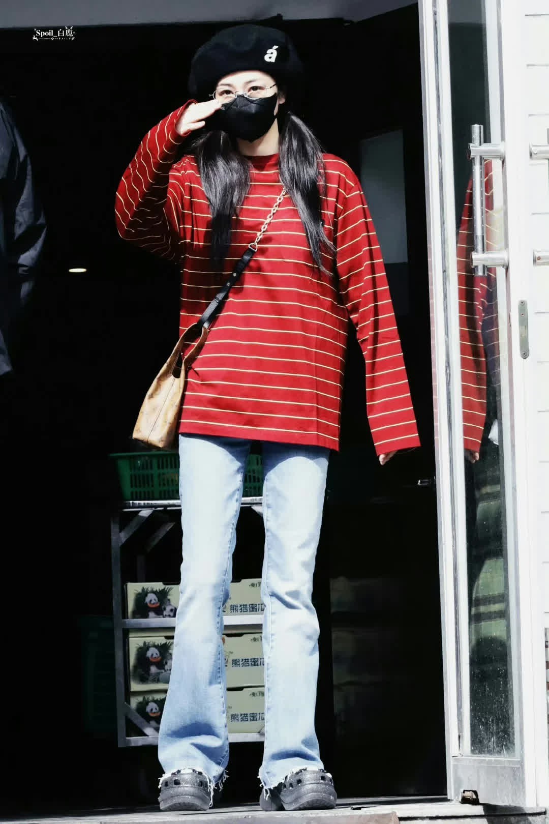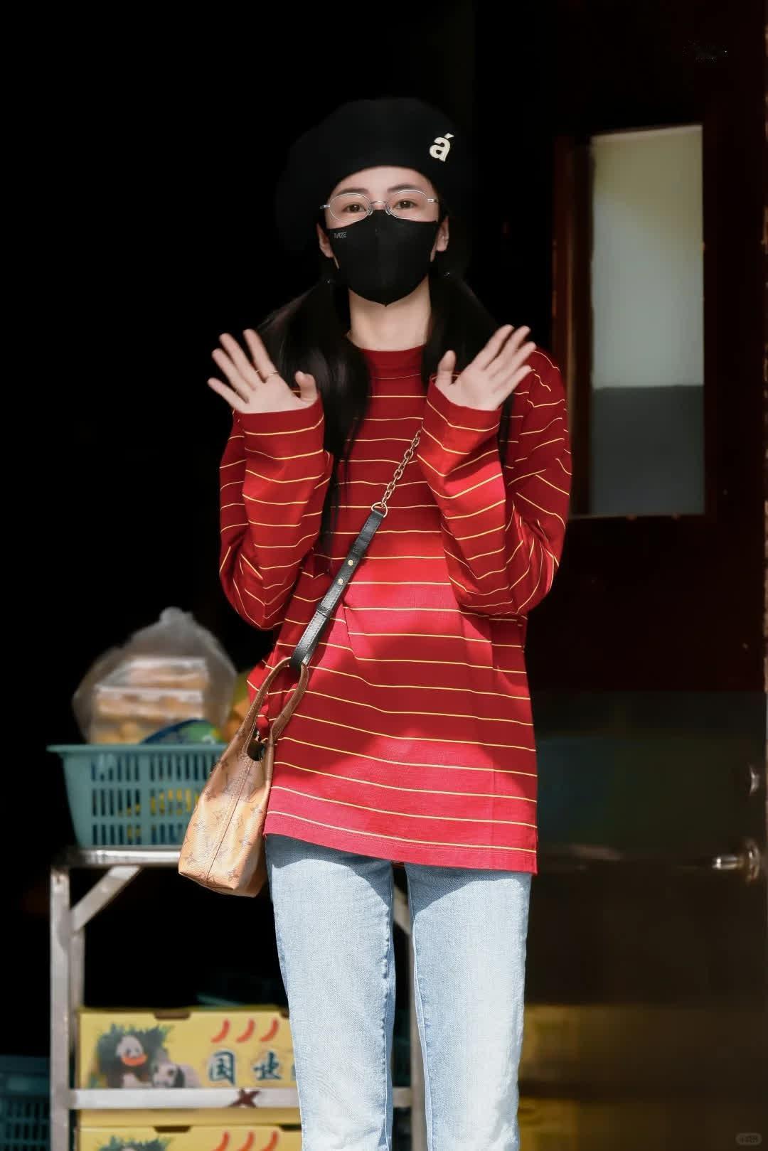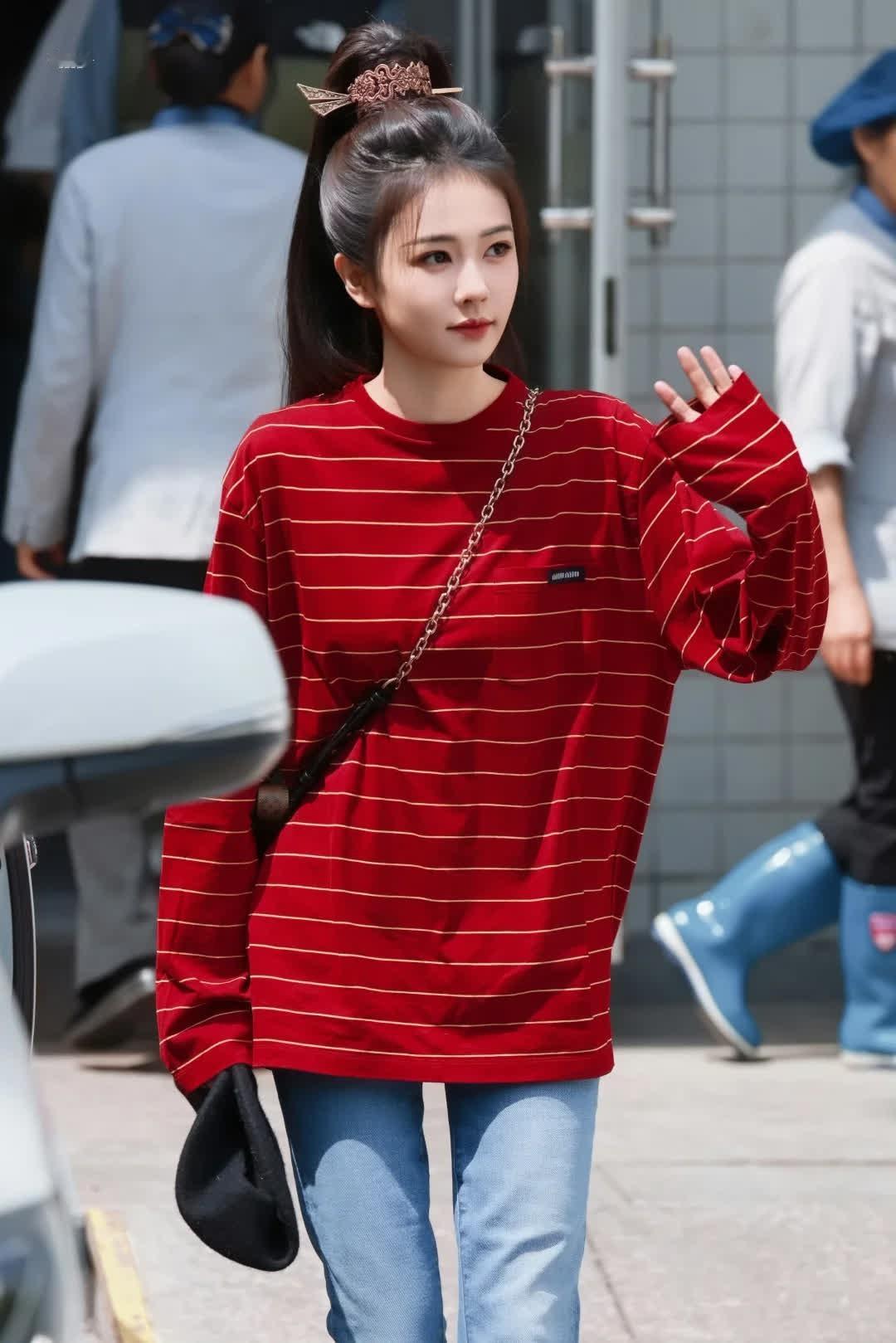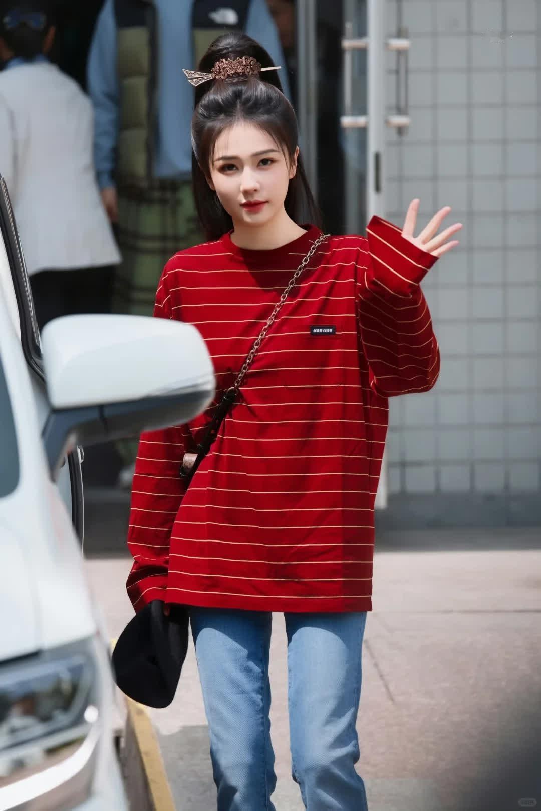 时尚穿搭 |白鹿今日上班路透,青春又元气~ 白鹿今日上班穿搭 一身红色条纹长袖