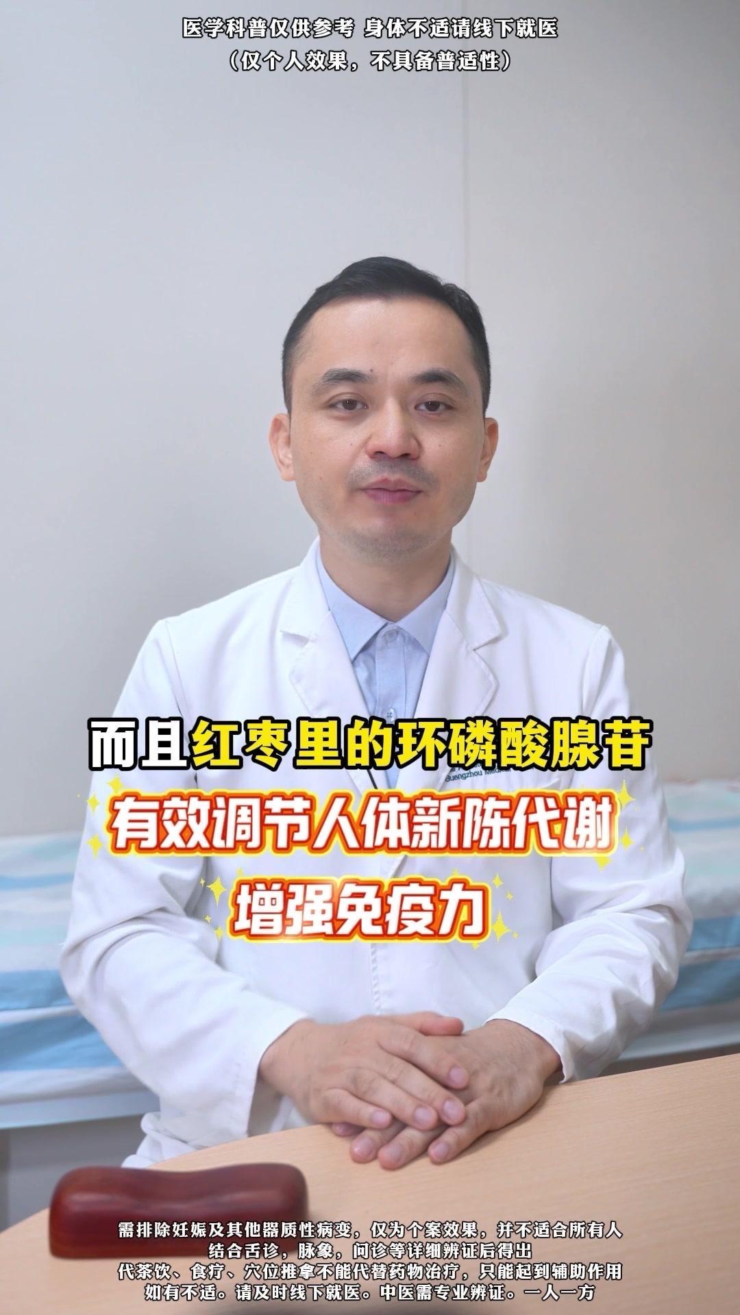 🍵每天一杯红枣水,有什么好处?💡大家都喜欢在保温杯里泡红枣,但很多人不知道喝红枣水到底好在哪,大多跟风随大流。今天高医生从中西医的角度给大家说道说道。 红枣在中医学里,性温味甘,归脾胃心经,能补中益气,养血安神,适合脾胃虚弱、气血不足、失眠多梦的朋友。 💡现代研究显示,红枣富含多种维生素,像维生素C,含量相当高,每100克红枣中维生素C含量高达243毫克。它还含有丰富的矿物质,如铁元素,这些营养成分有助于促进血红蛋白的合成,改善贫血状况,可以起到补血养颜的作用。 💡而且红枣里的环磷酸腺苷,能有效调节人体的新陈代谢,增强免疫力。除了补气血,红枣对肝脏也有一定益处。某些成分能减轻化学物质对肝脏的损伤,促进肝细胞的修复与再生。 💡另外,它还能在一定程度上调节胃肠道功能,帮助消化。 💡是不是天天泡,顿顿喝效果最好?实则不然。 1️⃣红枣性温,吃多了易上火,尤其是体质偏热,容易长痘便秘的朋友,过量饮用红枣水可能加重症状。 2️⃣红枣含糖量较高,干红枣含糖量约60%,糖尿病患者需严格控制量,每天不宜超过3-5颗,以免血糖大幅波动。