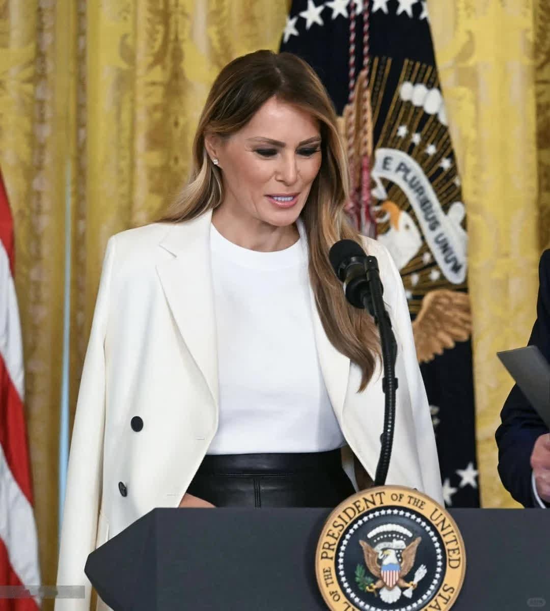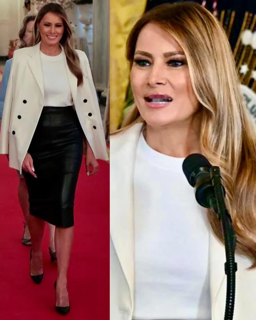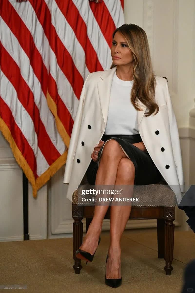 为纪念芭芭拉·布什而发行的邮票揭幕~Dior的西装内搭白T和半身皮裙,脚踩真爱品牌CL恨天高,还是那个脚底生风、酷飒美的梅拉尼娅~