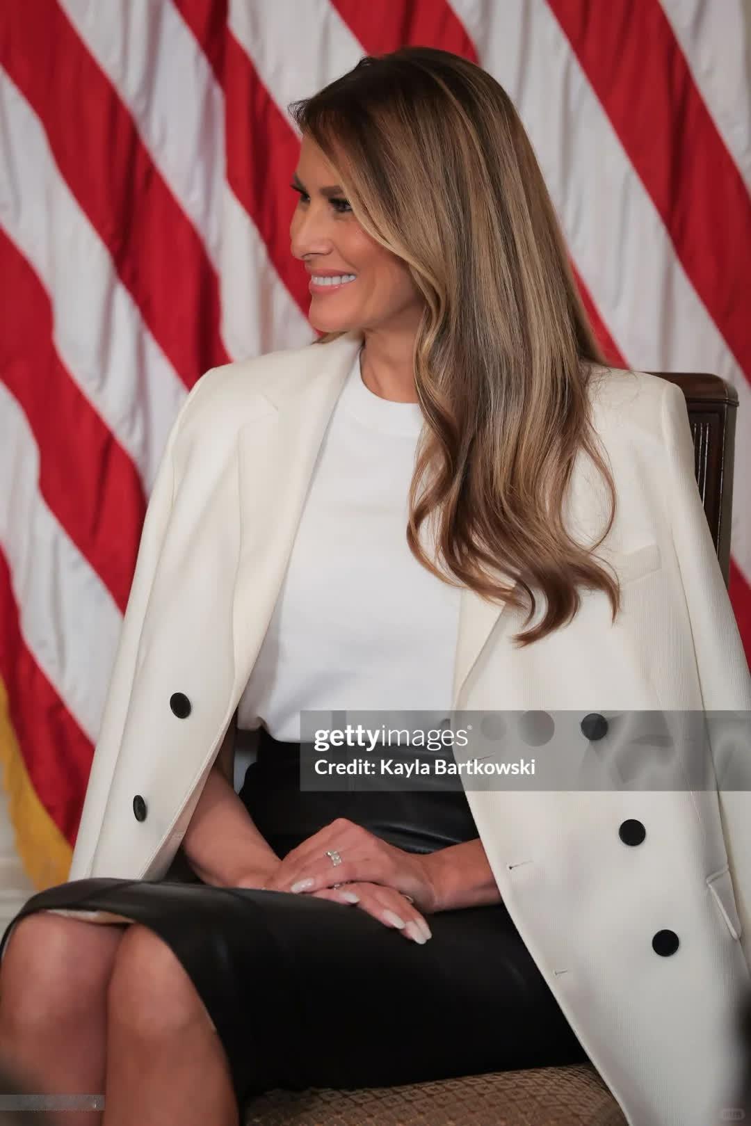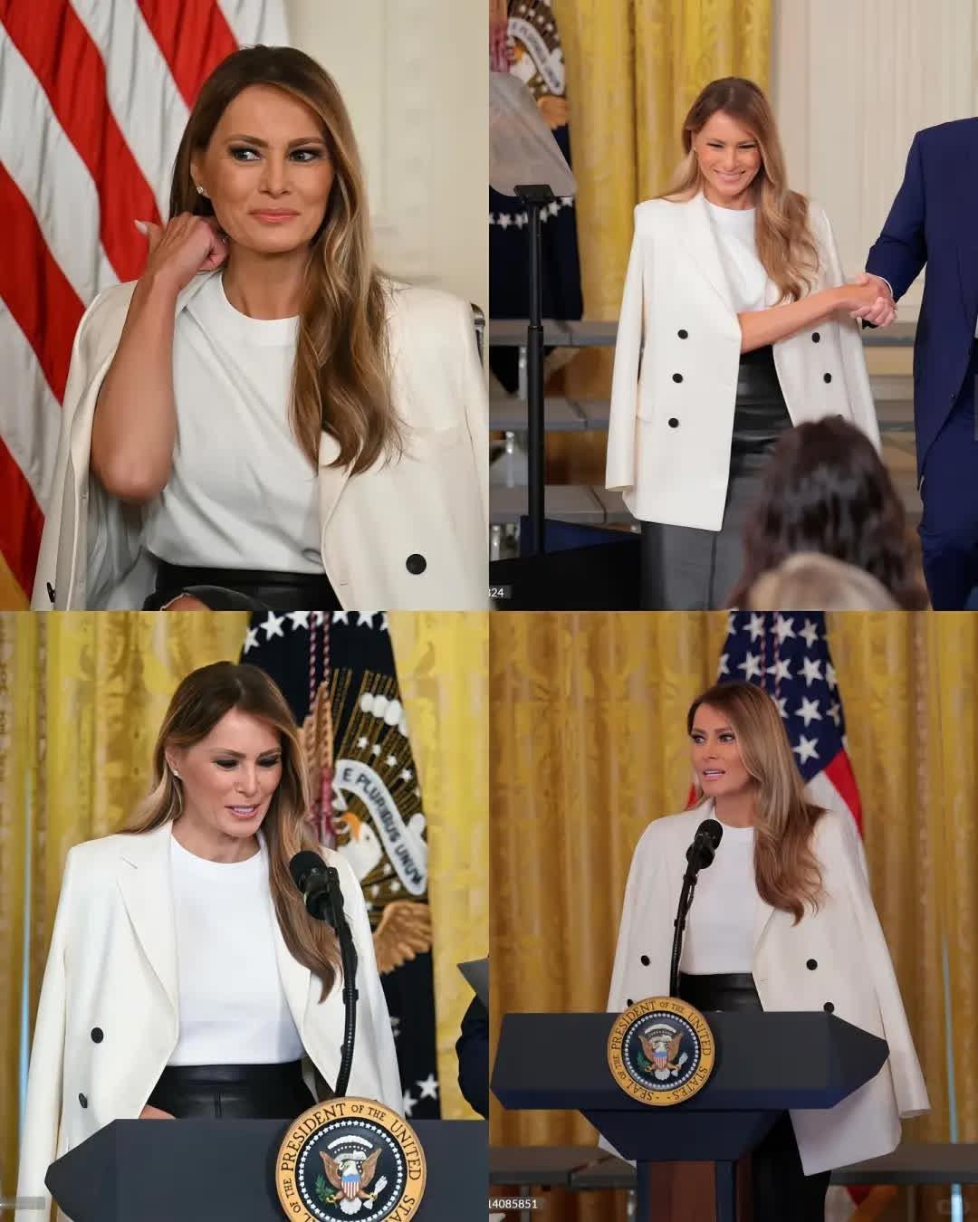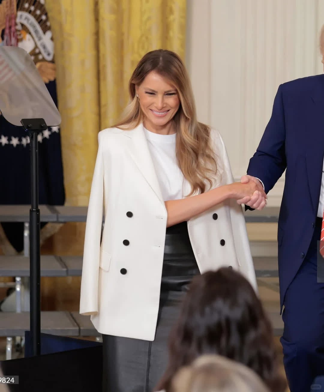 为纪念芭芭拉·布什而发行的邮票揭幕~Dior的西装内搭白T和半身皮裙,脚踩真爱品牌CL恨天高,还是那个脚底生风、酷飒美的梅拉尼娅~