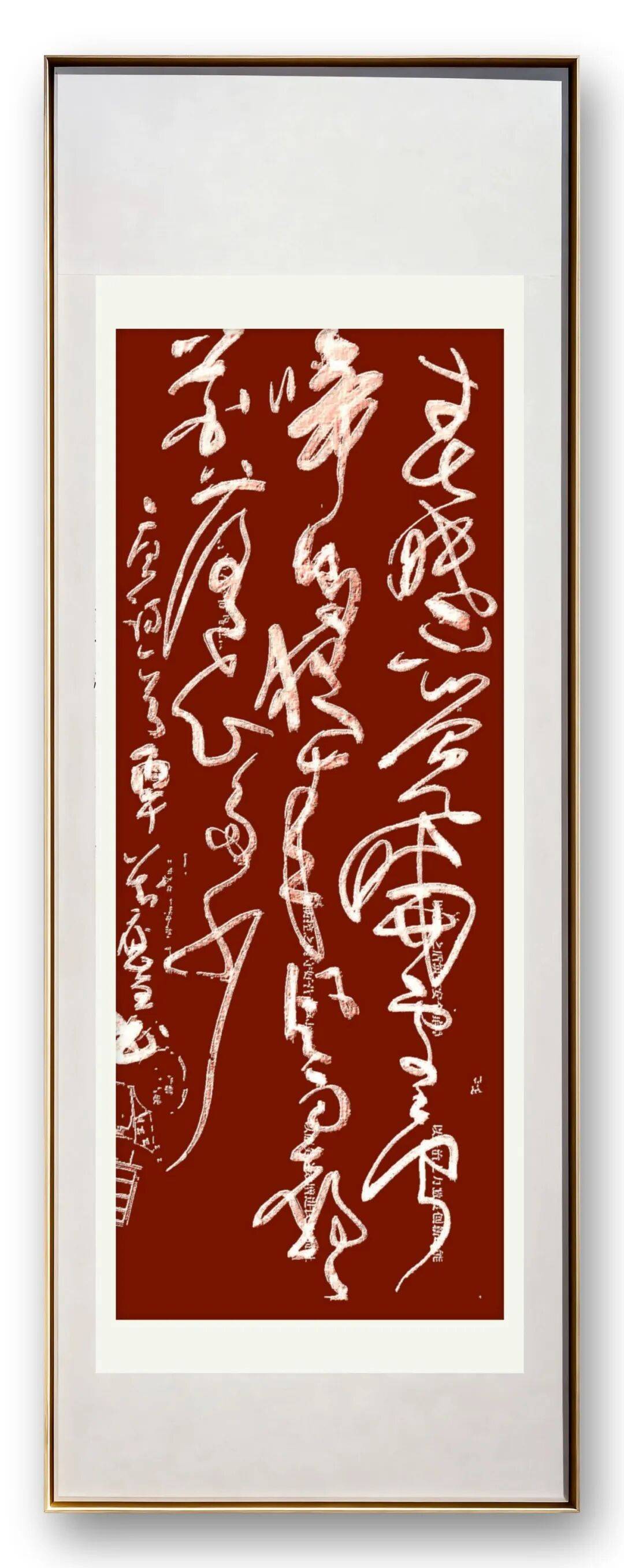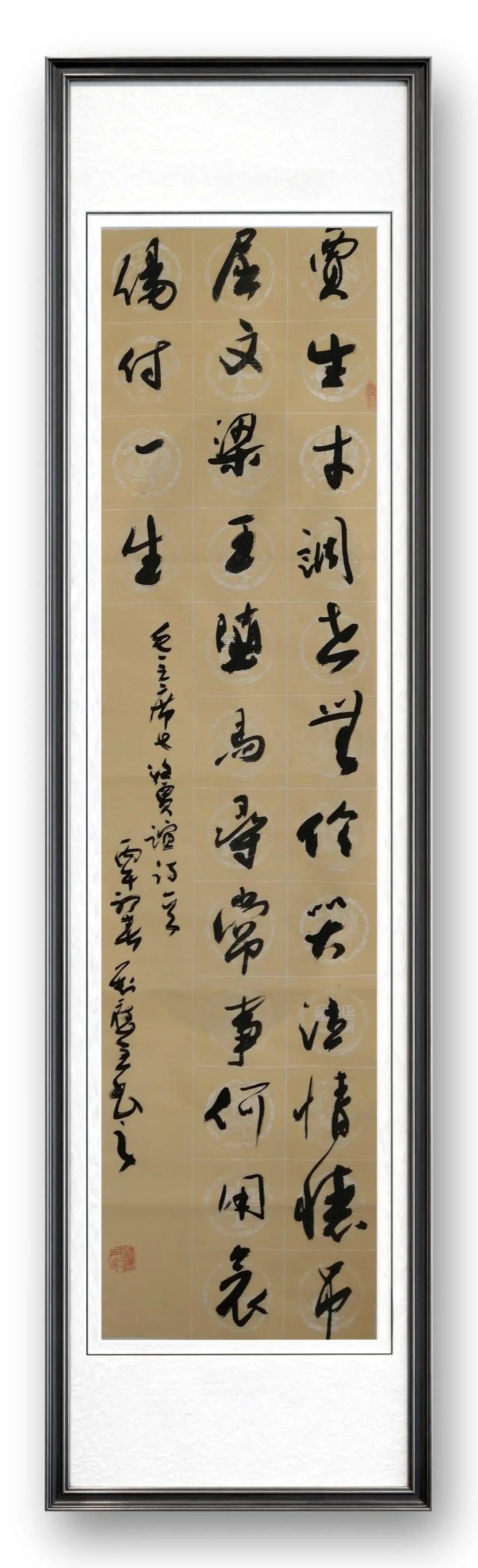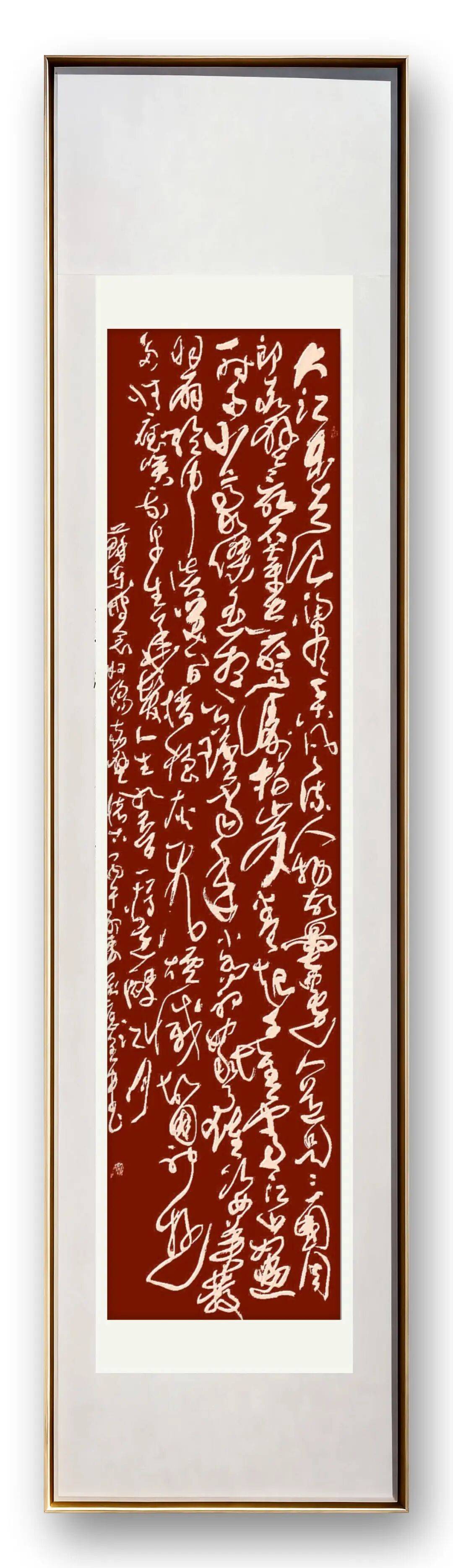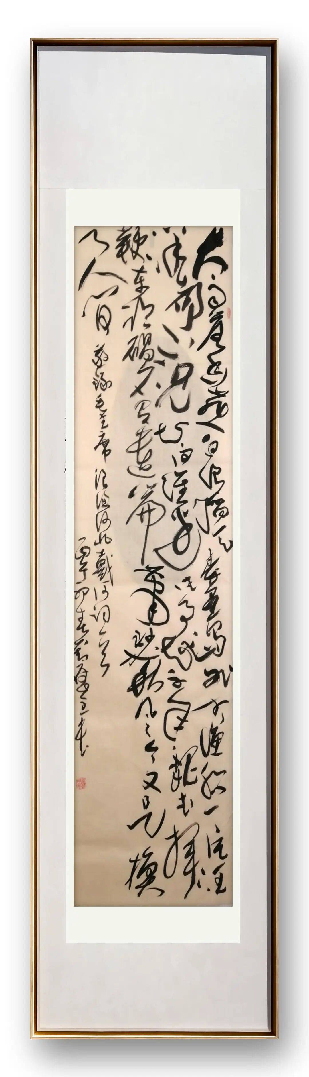 先生草书作品,则更见先生的艺术豪情与创作张力。其笔势如奔雷走电,线条连绵缠绕,纵横捭阖,如蛟龙出海,气势磅礴。先生以狂草之体,将笔墨的抒情性发挥到极致,点画狼藉而不失法度,结构奇险而归于平正,看似无法,实则处处有法,是数十年临帖功夫的自然流露。墨色的枯湿浓淡变化丰富,燥笔如秋风扫叶,润笔似春雨润物,在虚实相生间营造出强烈的视觉冲击力与艺术感染力。通篇气韵生动,神采飞扬,将书写者的胸襟、气度与豪情尽数倾注于笔端,真正做到了