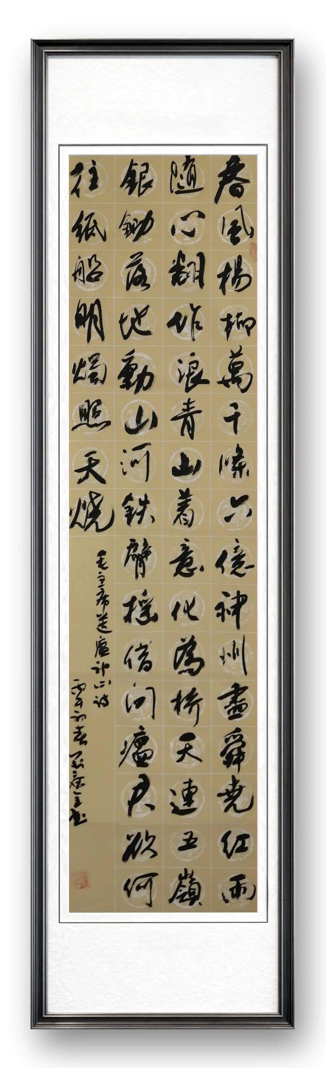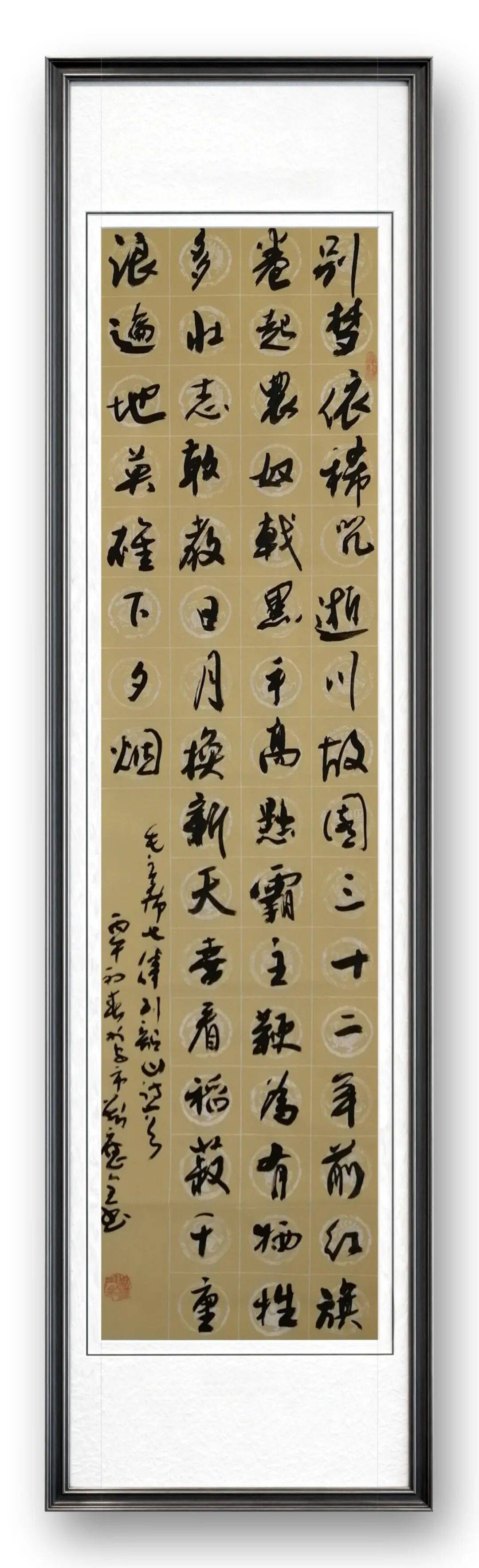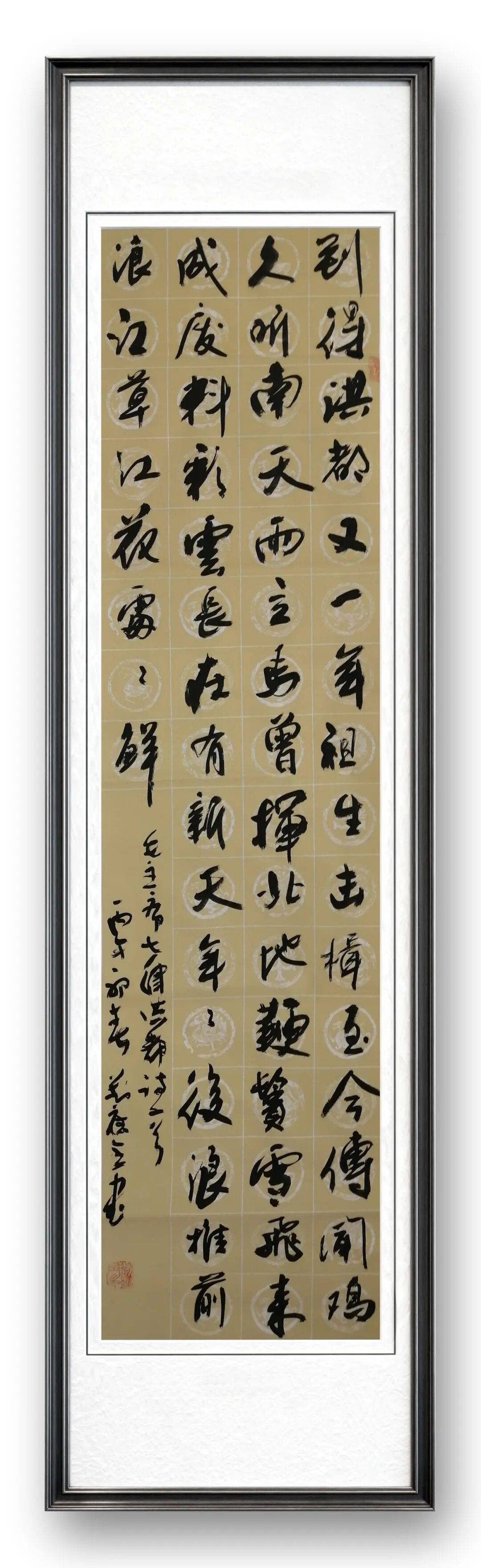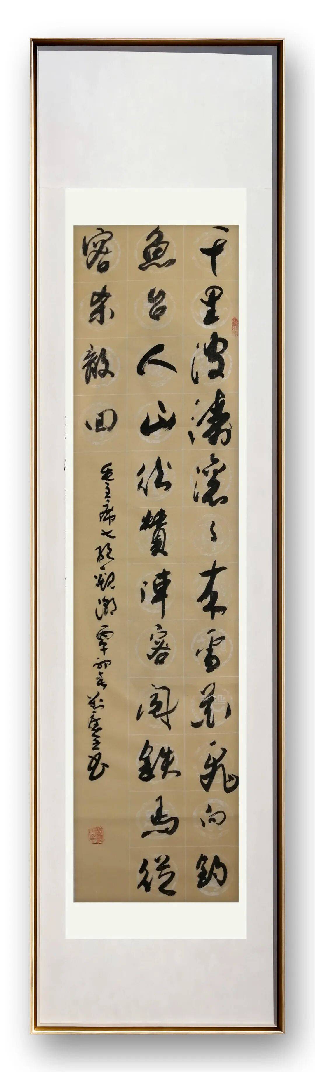 先生草书作品,则更见先生的艺术豪情与创作张力。其笔势如奔雷走电,线条连绵缠绕,纵横捭阖,如蛟龙出海,气势磅礴。先生以狂草之体,将笔墨的抒情性发挥到极致,点画狼藉而不失法度,结构奇险而归于平正,看似无法,实则处处有法,是数十年临帖功夫的自然流露。墨色的枯湿浓淡变化丰富,燥笔如秋风扫叶,润笔似春雨润物,在虚实相生间营造出强烈的视觉冲击力与艺术感染力。通篇气韵生动,神采飞扬,将书写者的胸襟、气度与豪情尽数倾注于笔端,真正做到了