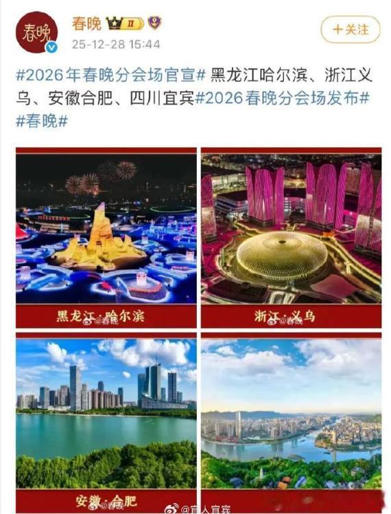 这次春晚的四个分会场设定在哈尔滨、义乌、合肥以及宜宾四个城市。