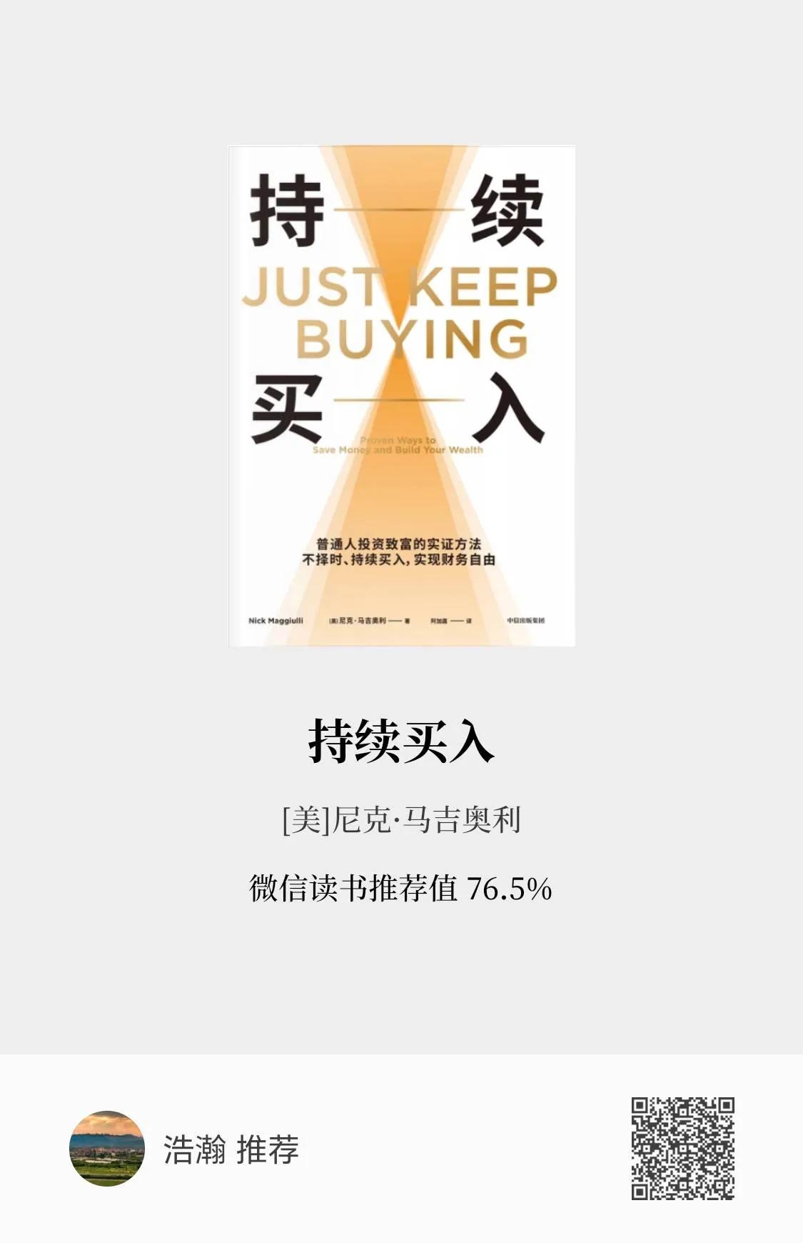 昨夜纳指100 小跌0.37%,然而今日场内纳指100 跌幅达近1%,目前诸多纳基已经跌破净值,而基金净值已经17连阳,简直颠覆了我的认知,美股怎么是这样一个东西?是我认识的美股嘛? 美股今天的涨跌我们无法猜测,只要说自己知道涨跌的全是假的。 但是我知道美股未来一定是涨的,时间越久我们的投资标的涨的会越厉害。坚定定投,只买不卖! 今天向大家推荐基金投资宝典书籍,《持续买入》,这本书是我在投资全仓纳指基金时间不长偶然看网上寻找资料发展的,这本书分为储蓄和投资两部分。储蓄部分将包括存钱的方方面面:存多少钱,如何存更多钱,如何没有负罪感地花钱,等等。投资部分涵盖“钱生钱”的方方面面:为什么应该投资,应该投资什么,投资频率,等等。特别是其中对于投资股市与基金方面的内容是非常值得实践的。
