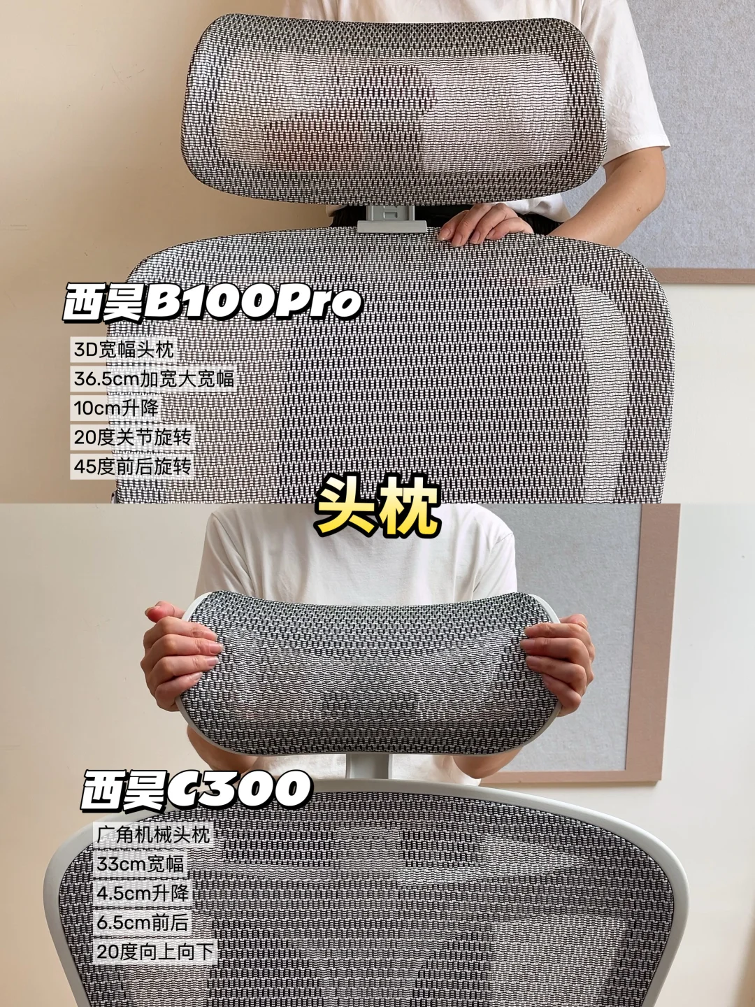 👉B100Pro是36.5cm加宽的大宽幅的3D头枕,升降、弧度都能调节。