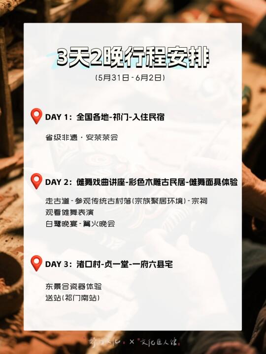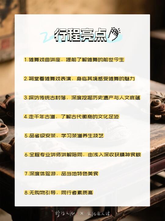 行程亮点: 1.傩舞戏曲讲座,提前了解傩舞的前世今生 2.祠堂看傩舞戏表演,身临其境感受傩舞的魅力 3.探访传统古村落,深度挖掘历史遗产与人文底蕴 4.走千年古道,了解古代徽商的文化足迹 5.品省级安茶,学习茶道养生技艺 6.全程专业讲师讲解陪同,由浅入深收获精神食粮 7.深度体验游,品当地特色美食,无购物引导,同行者素质高 欢迎感兴趣的朋友加入我们一起去探索徽州古村落里的千年傩舞!
