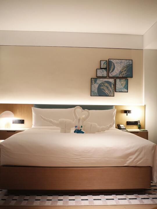 酒店在青岛新区,没有老城的喧嚣,酒店本身更是把源宿「健康环保」理念刻进了细节里:原木色和绿色交织的客房显得清新自然,毛巾精心折成小动物造型,俏皮又可爱,静静